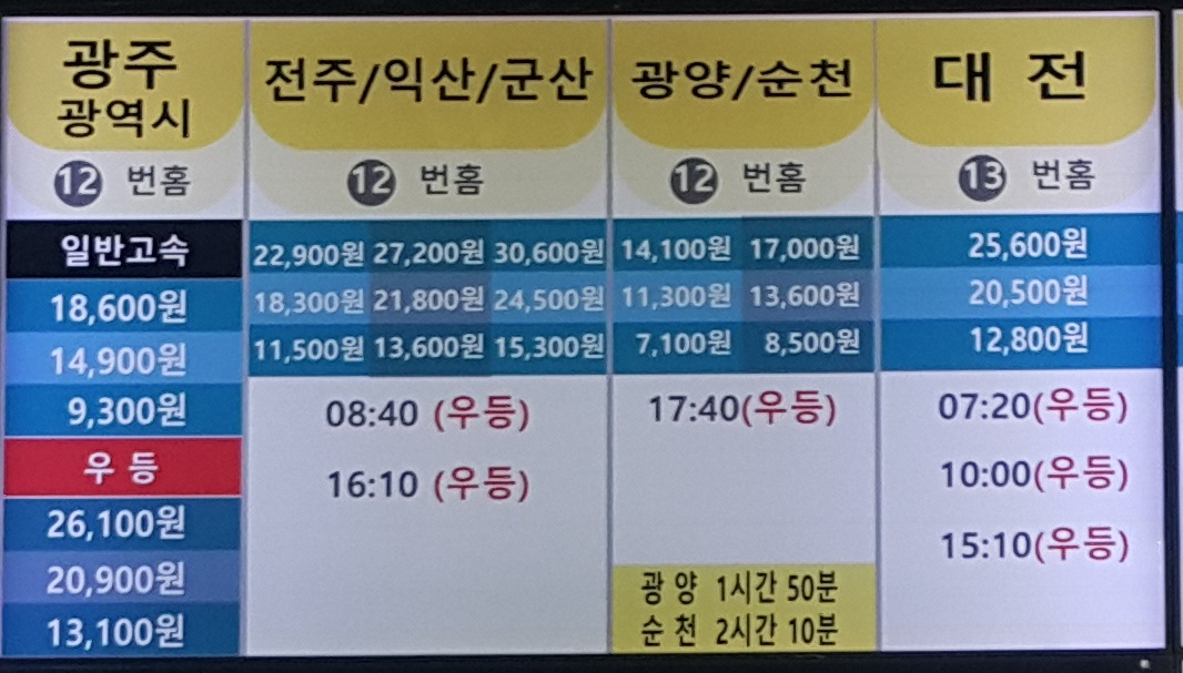 김해 출발 광주광역시, 전주, 익산, 군산, 광양, 순천, 대전 방면.