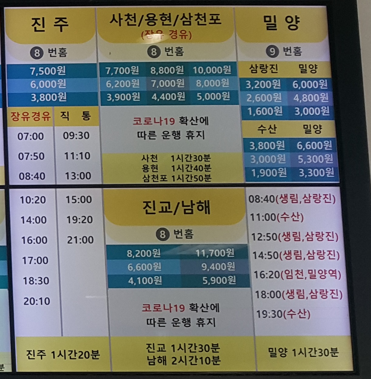 김해 출발 진주, 사천, 용현, 삼천포, 진교, 남해, 밀양 방면.
