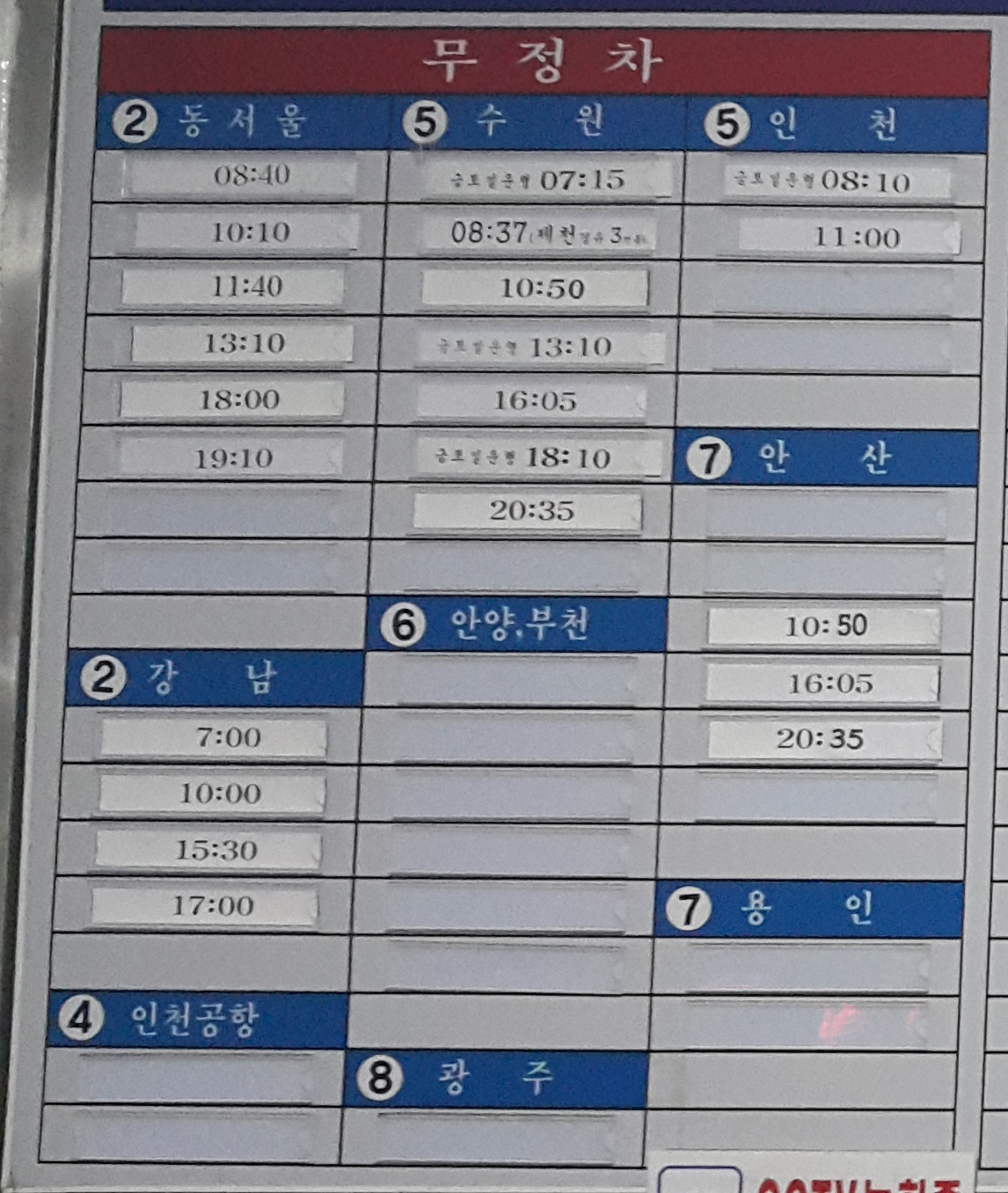 영월 출발 동서울, 강남, 수원, 인천, 안산 방면.