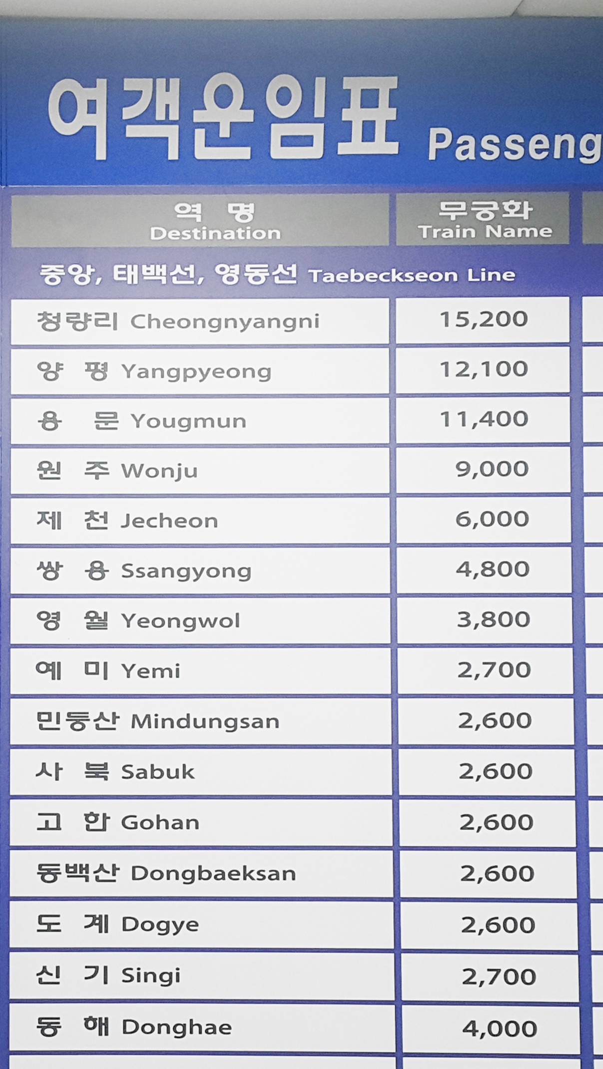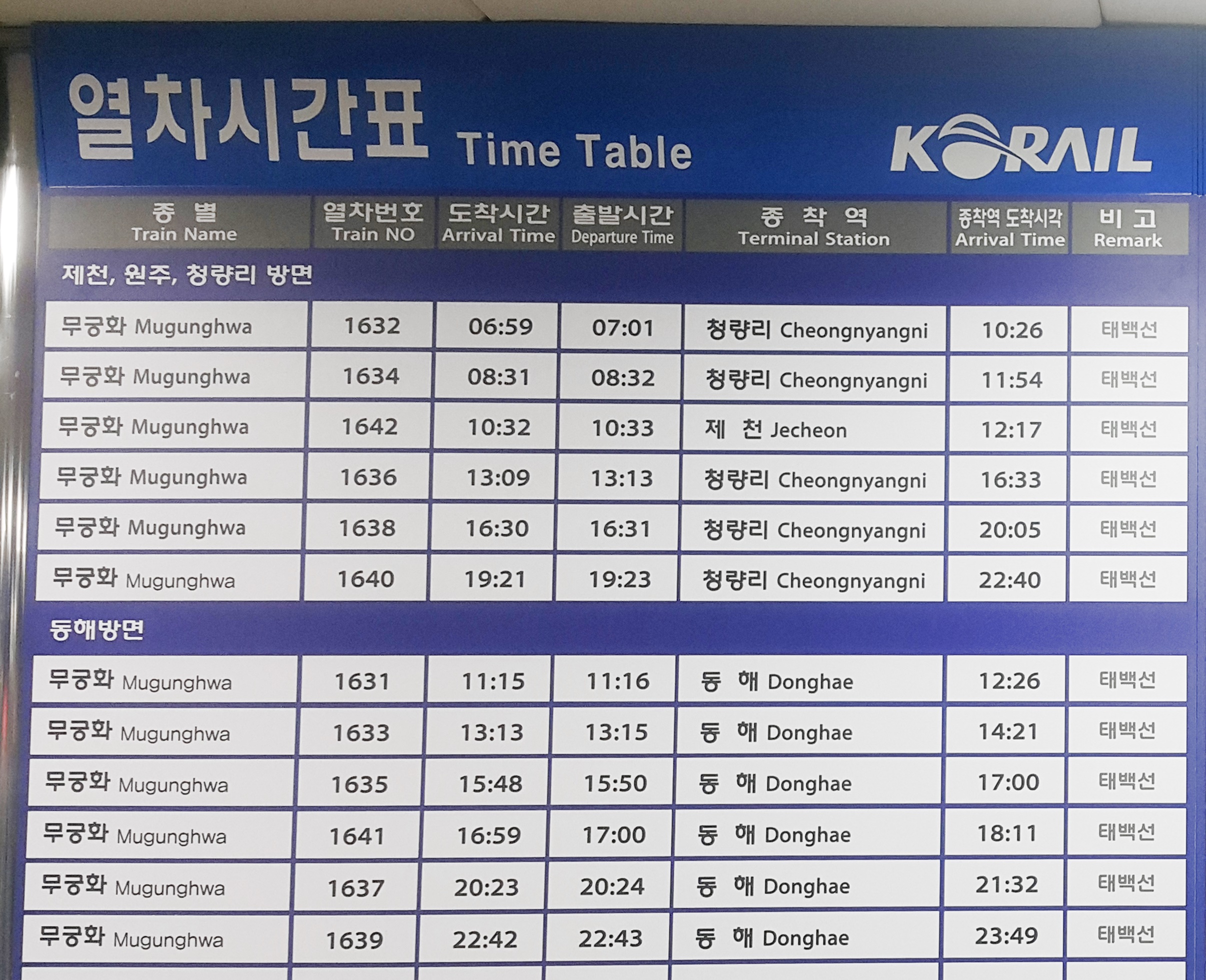 태백역 출발 동해, 제천, 원주, 청량리 방면.