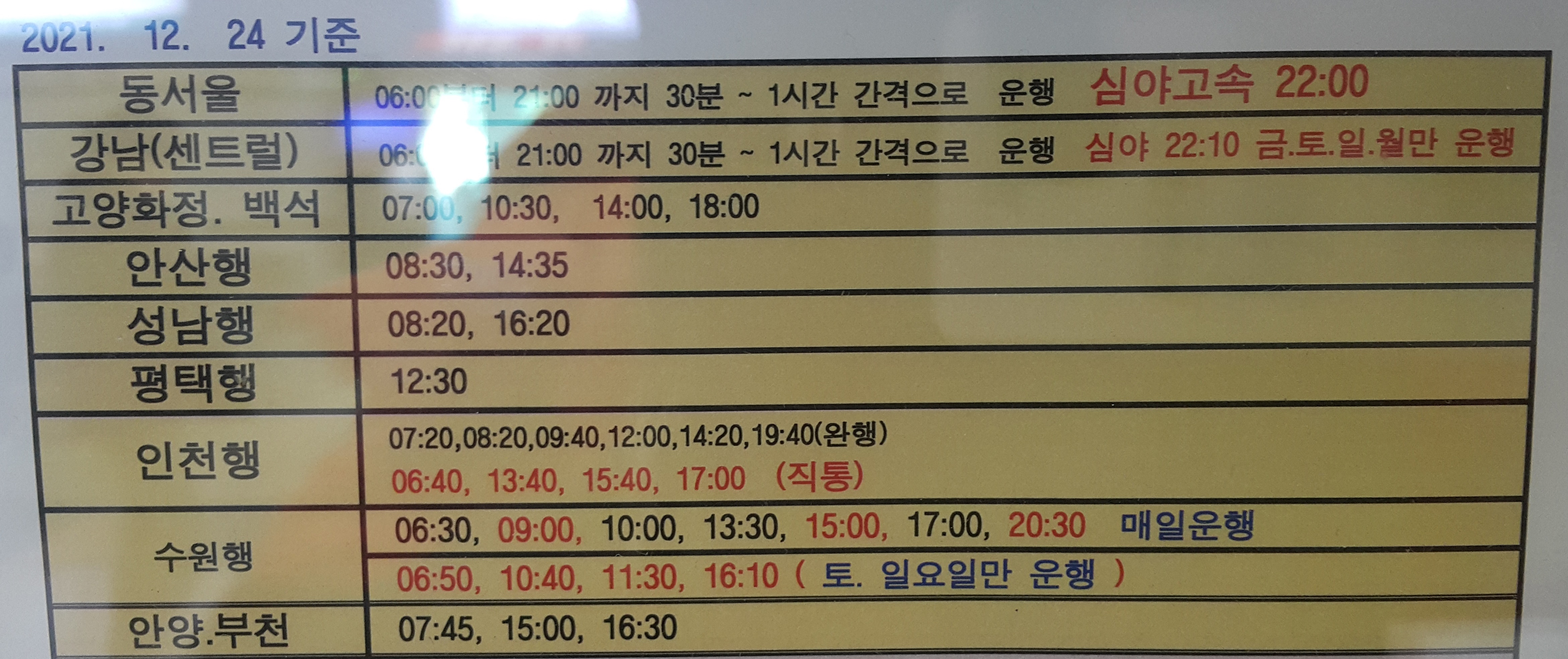 충주 출발 동서울, 강남, 고양화정, 백석, 안산, 성남, 평택, 인천, 수원, 안양, 부천 방면.