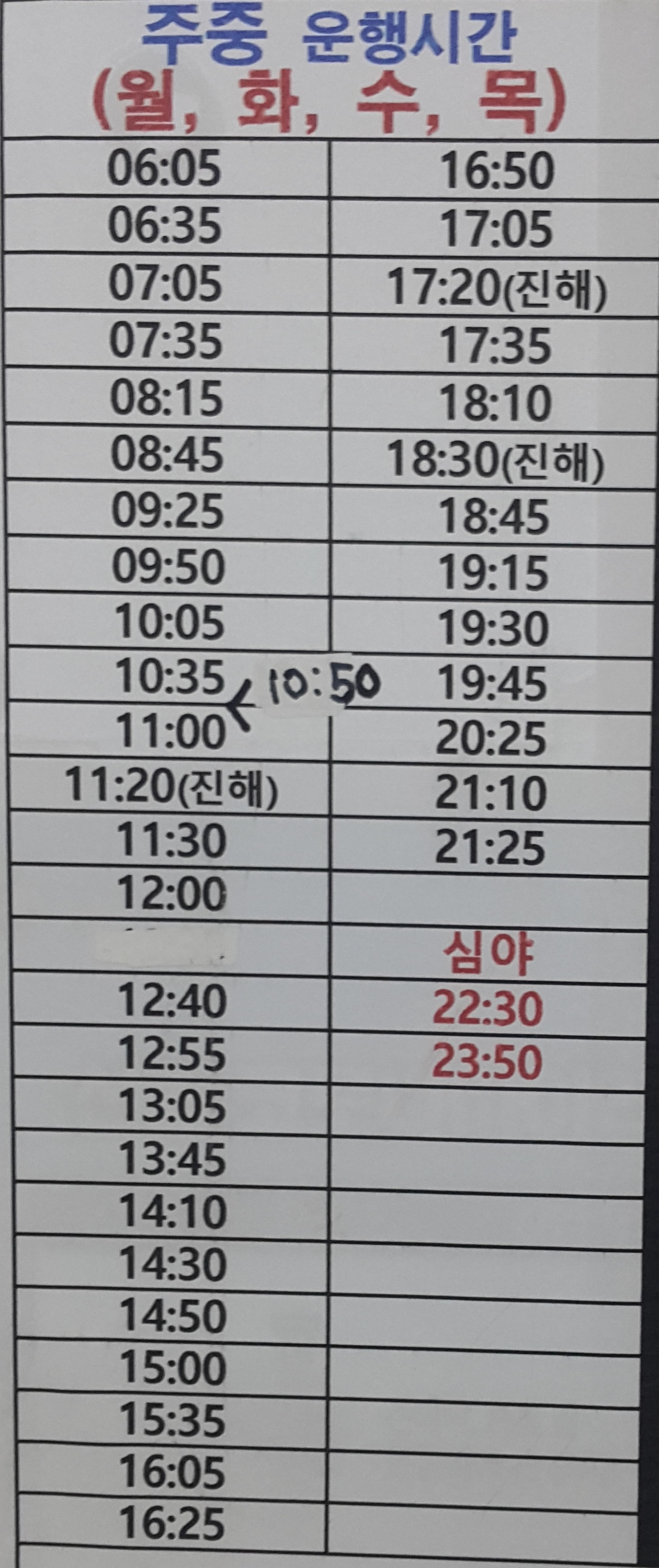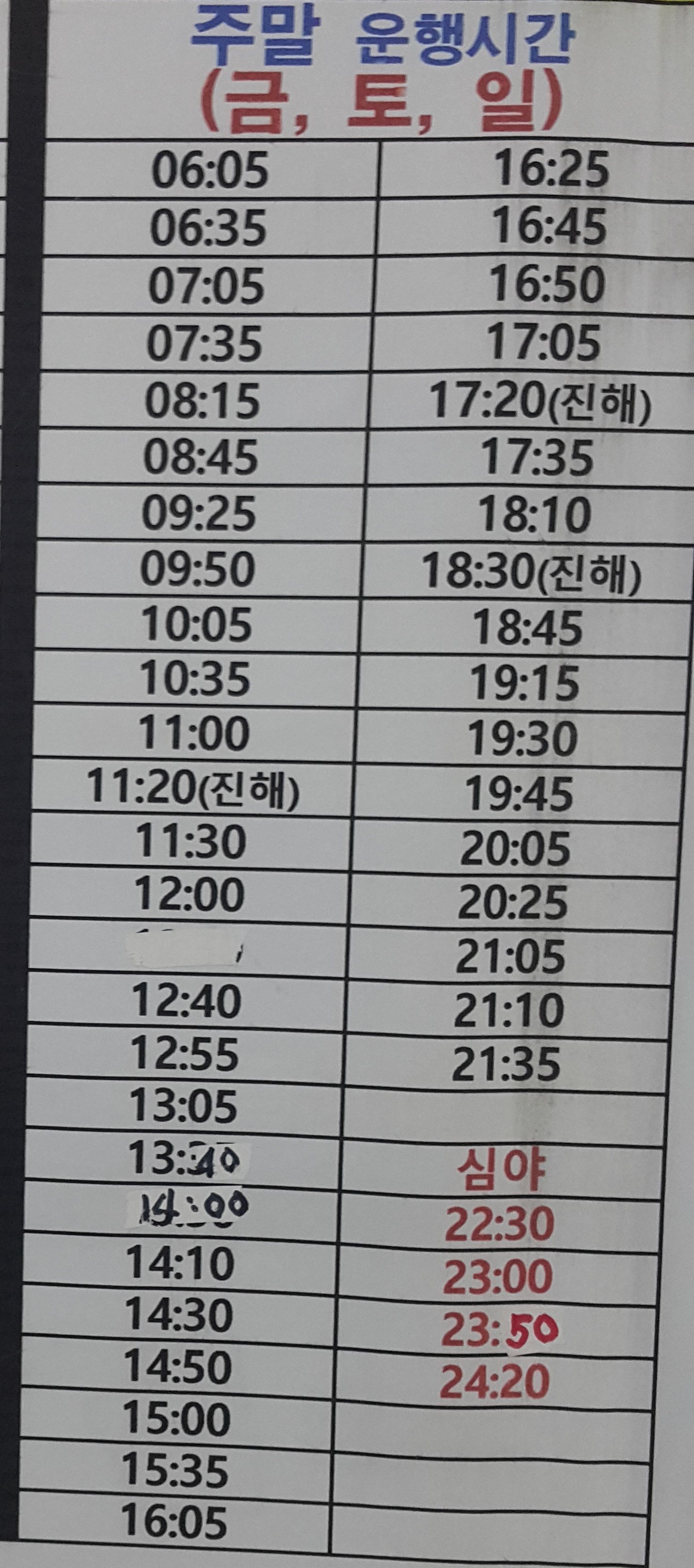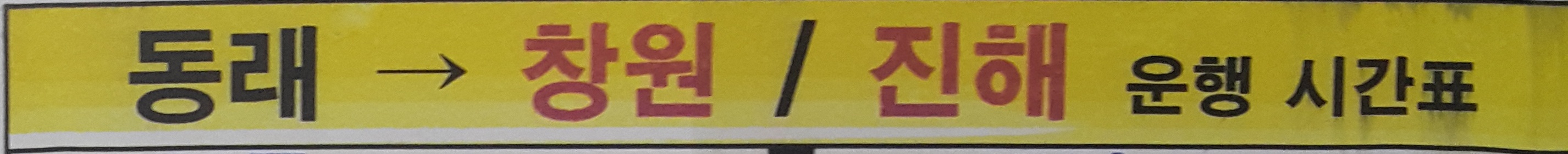 동래 출발 창원, 진해 주중, 주말 운행 시간표.