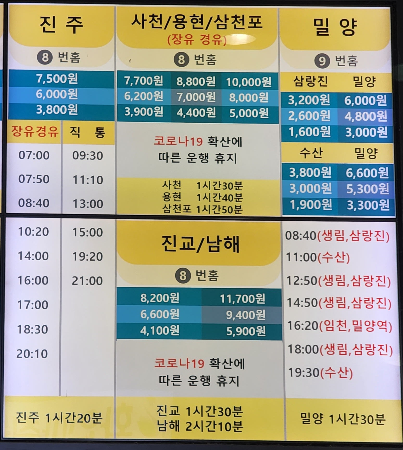 김해 출발 (운행 중지) 용인(신갈),동서울, 단양, 제천, 원주 방면