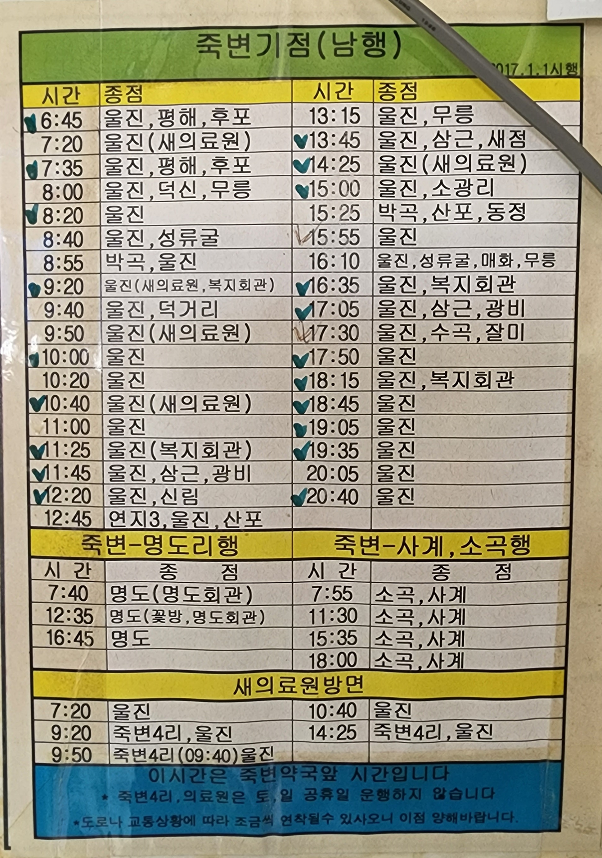 죽변 출발 덕구온천, 소곡, 주인3, 고포, 호산, 부구, 후정2, 검성리 방면.