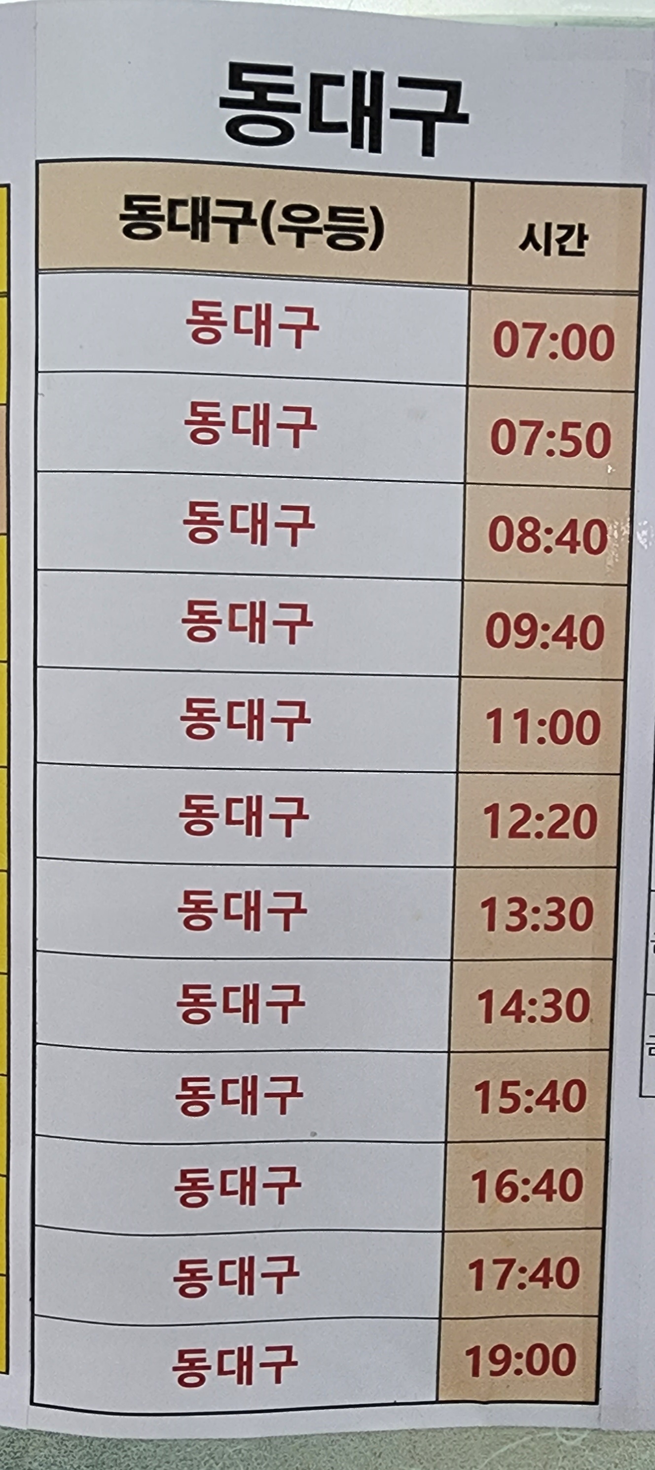 울진 출발 동서울, 죽변, 부구, 호산, 임원, 영주 방면.