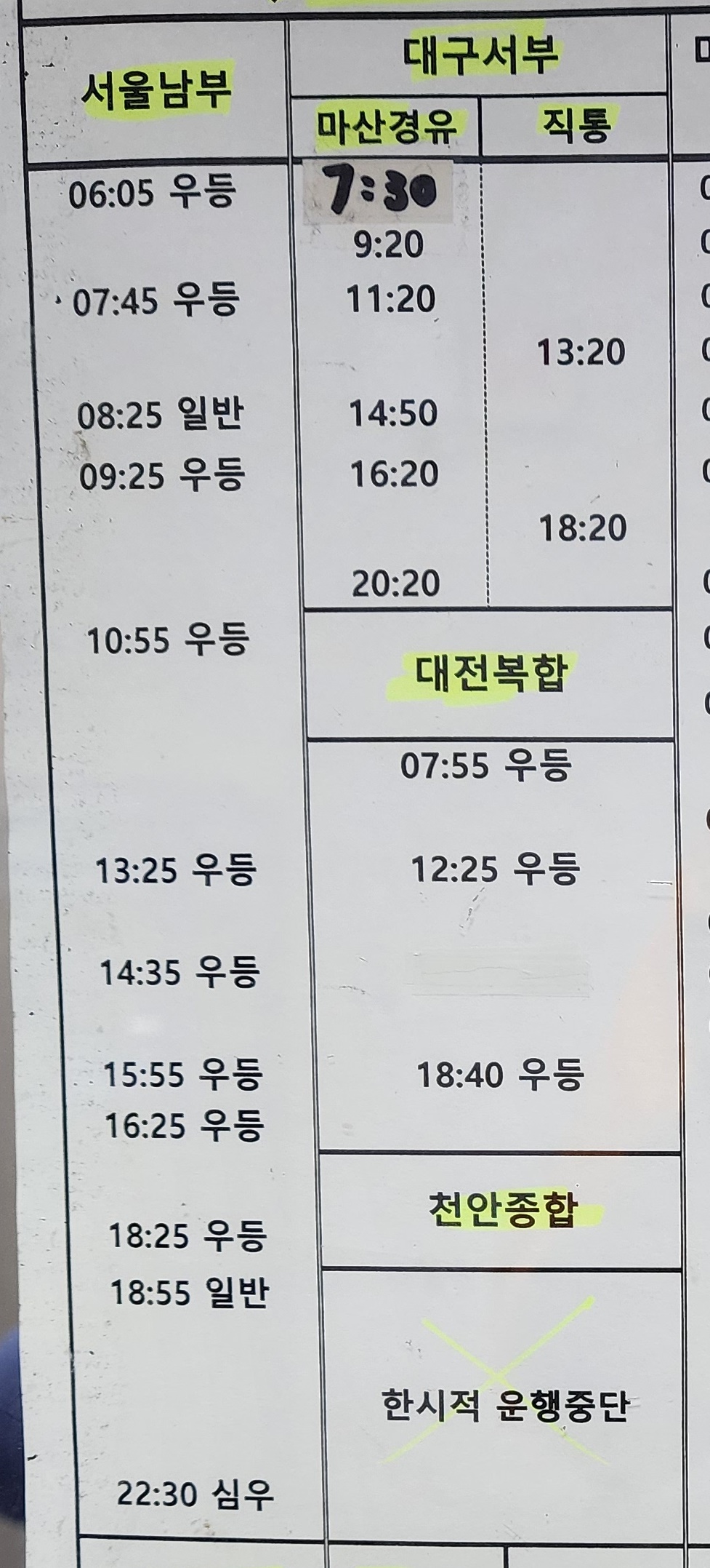 고성 출발 서울 남부, 대구 서부, 마산, 대전 복합 방면.