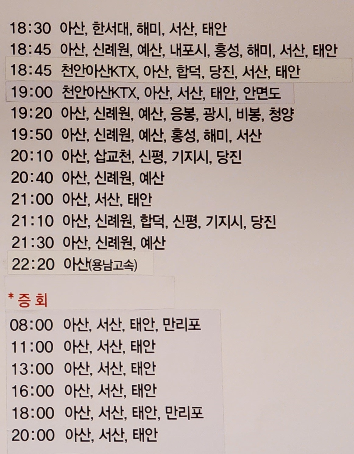 천안 출발 병천, 진천, 충북혁신도시 방면.