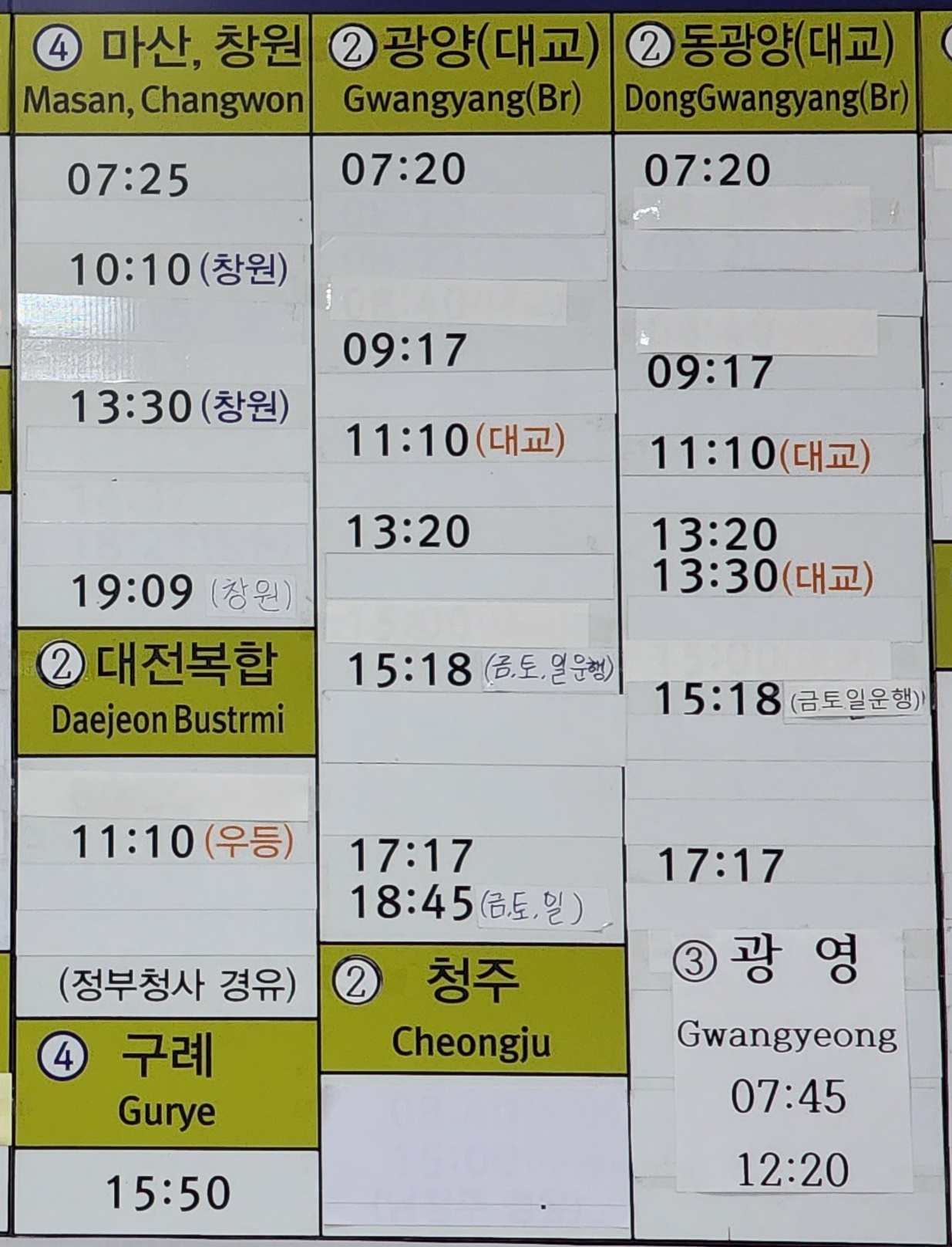 여수 출발 마산, 창원, 광양, 동광양, 대전 복합, 구례, 청주 방면.