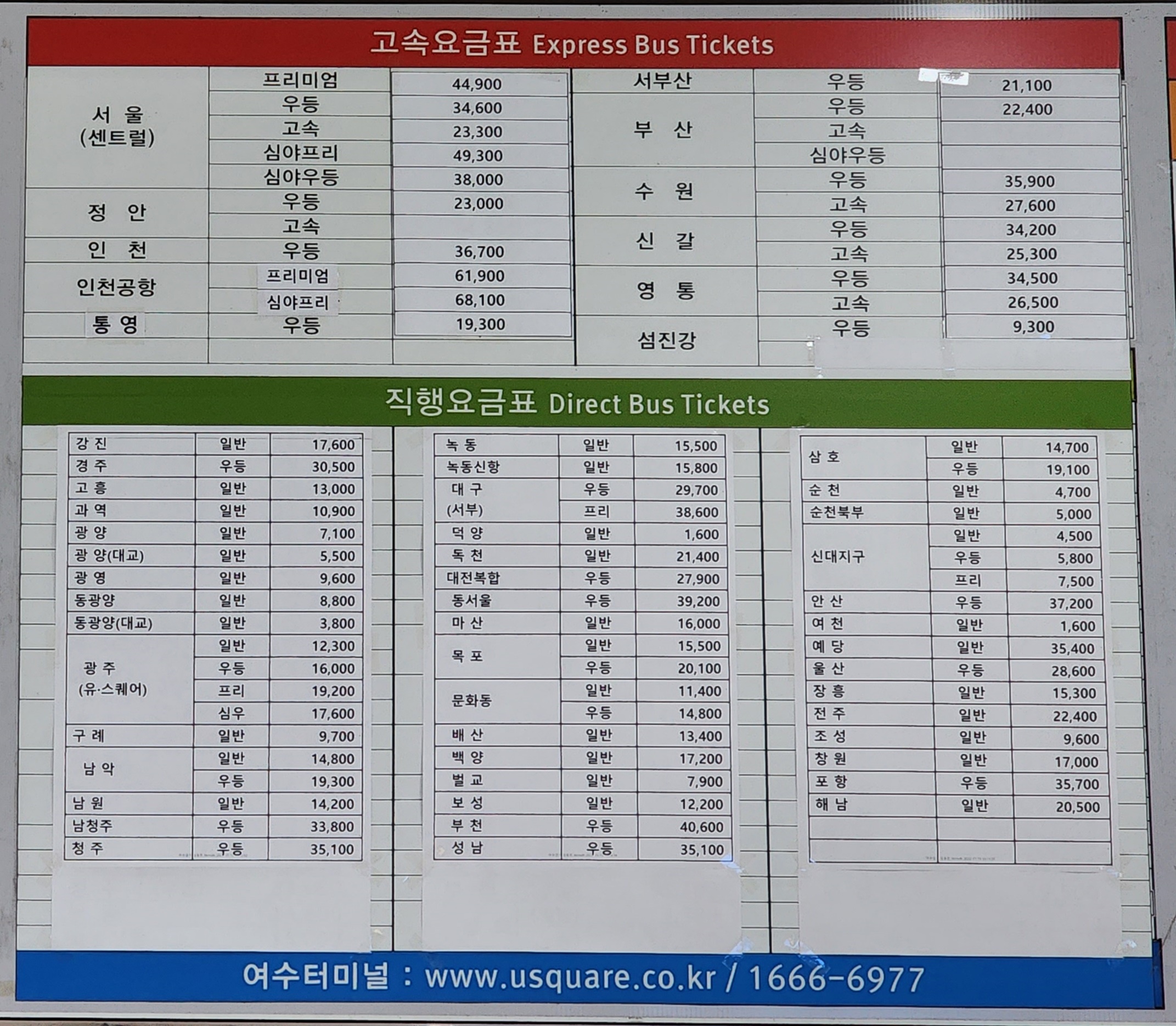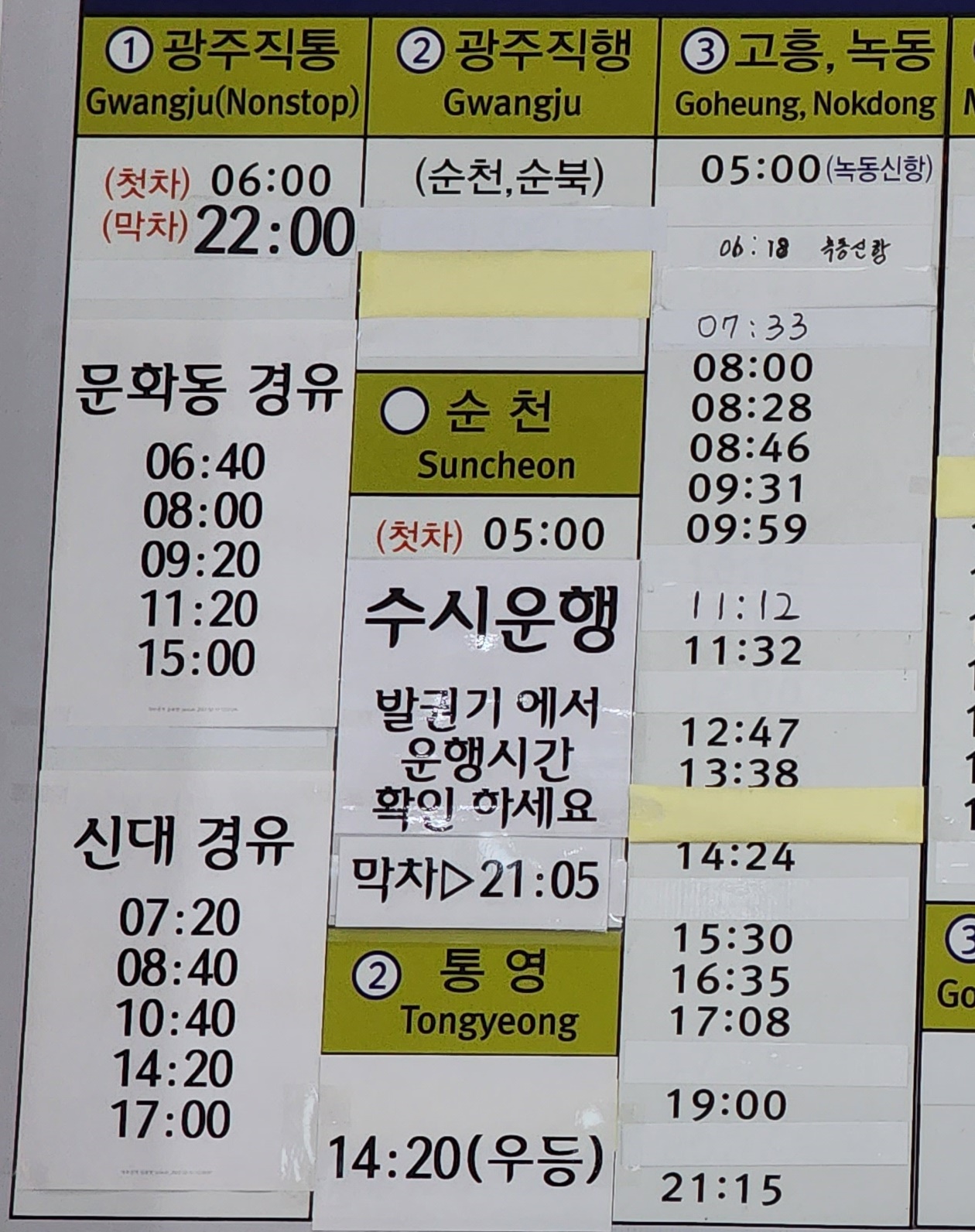 여수 출발 광주, 고흥, 녹동, 순천, 통영 방면.
