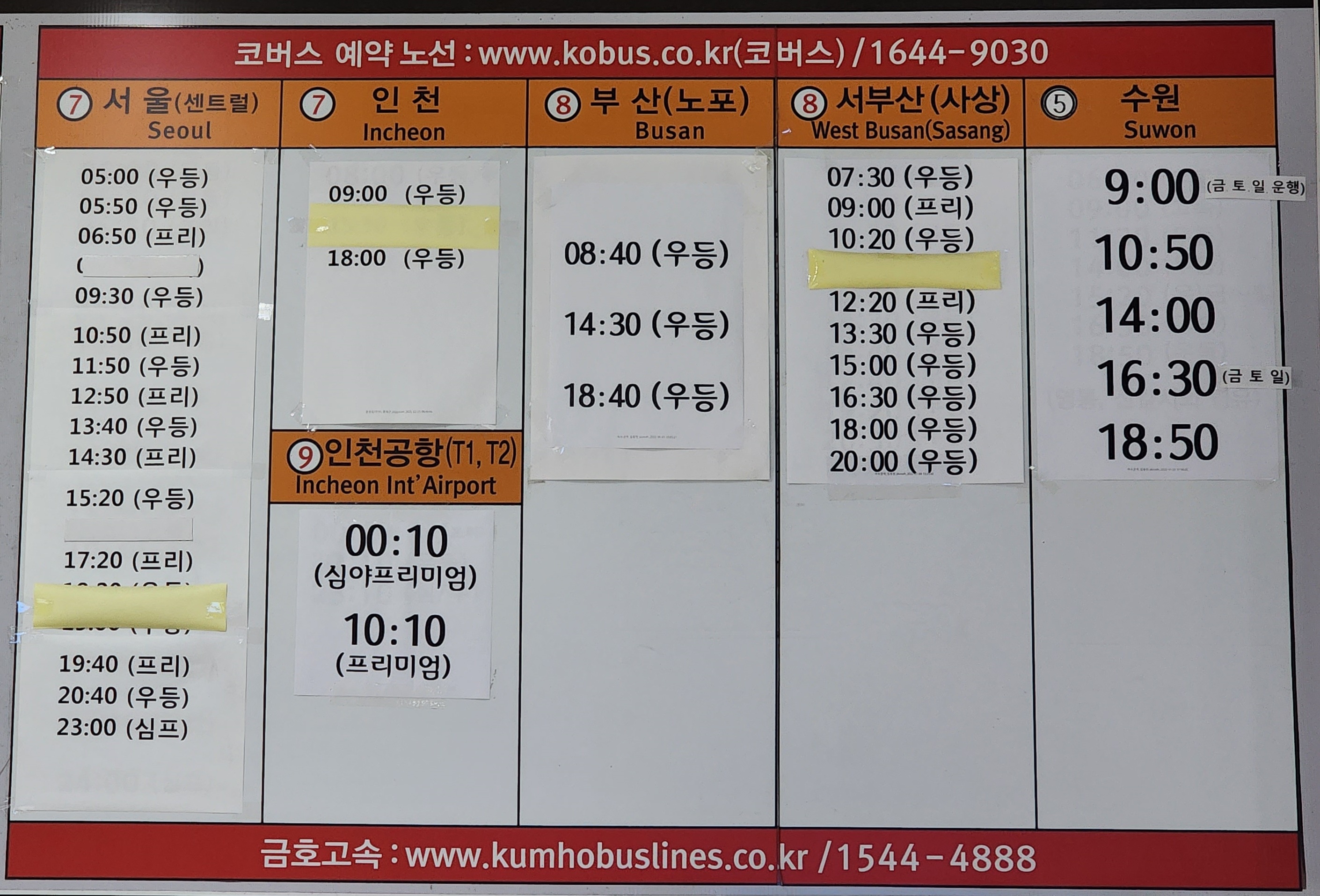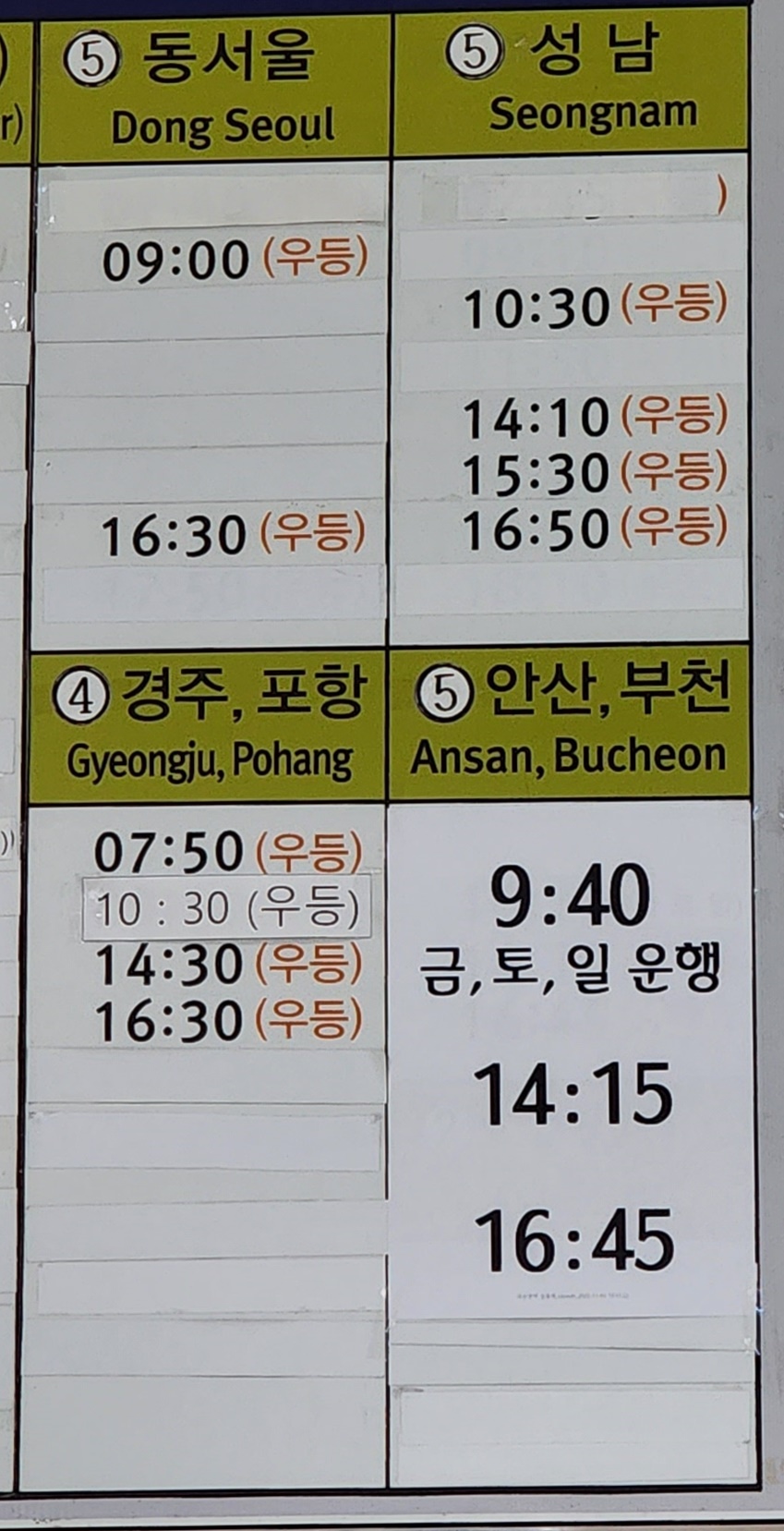 여수 출발 동서울, 성남, 경주, 포항, 안산, 부천 방면.