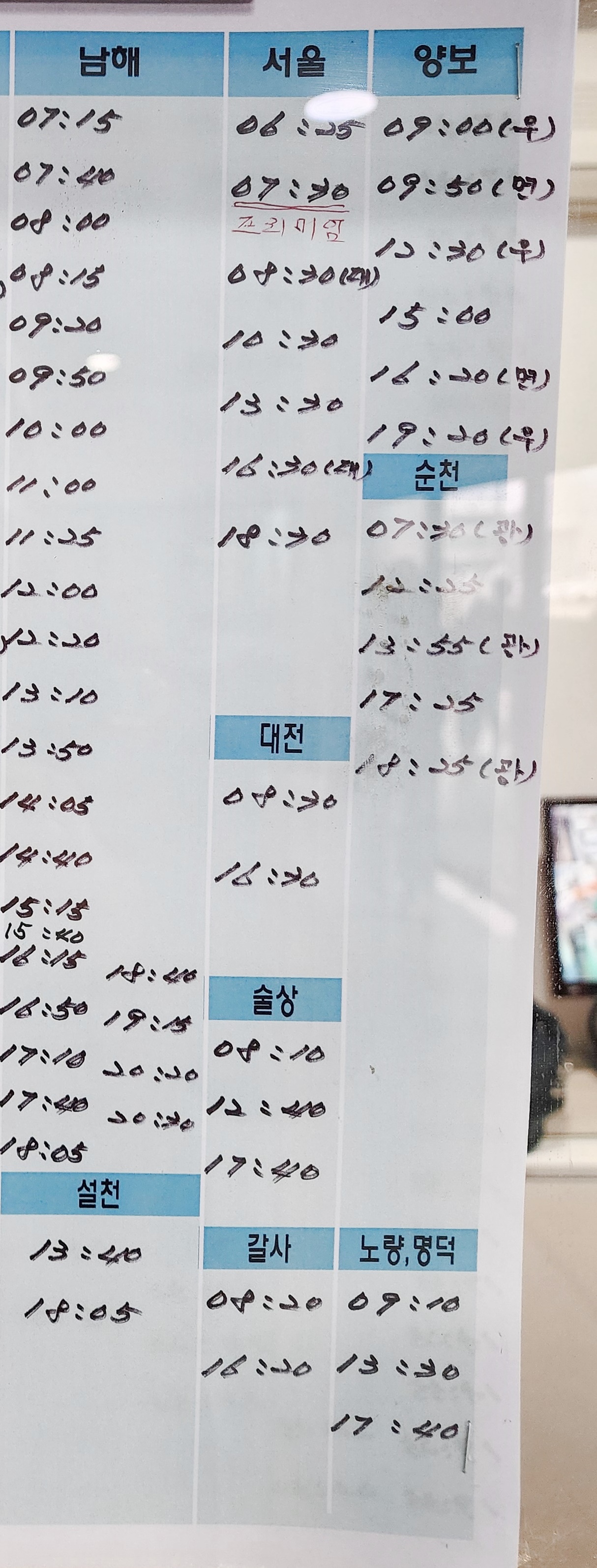 진교 출발 남해, 설천, 서울, 대전, 술상, 갈사, 양보, 순천, 노량, 명덕 방면.