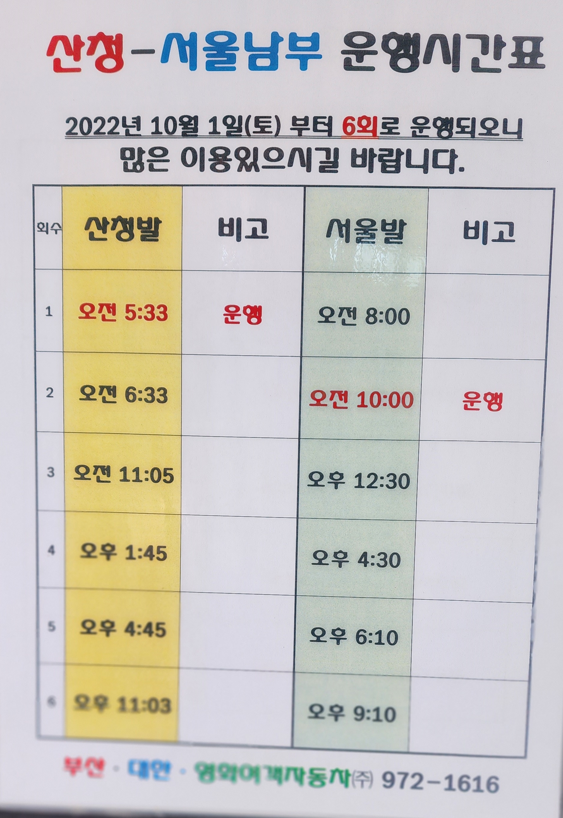 산청 출발 원지, 진주, 마산, 창원, 부산 방면.