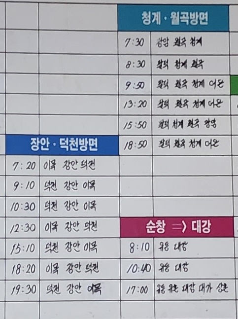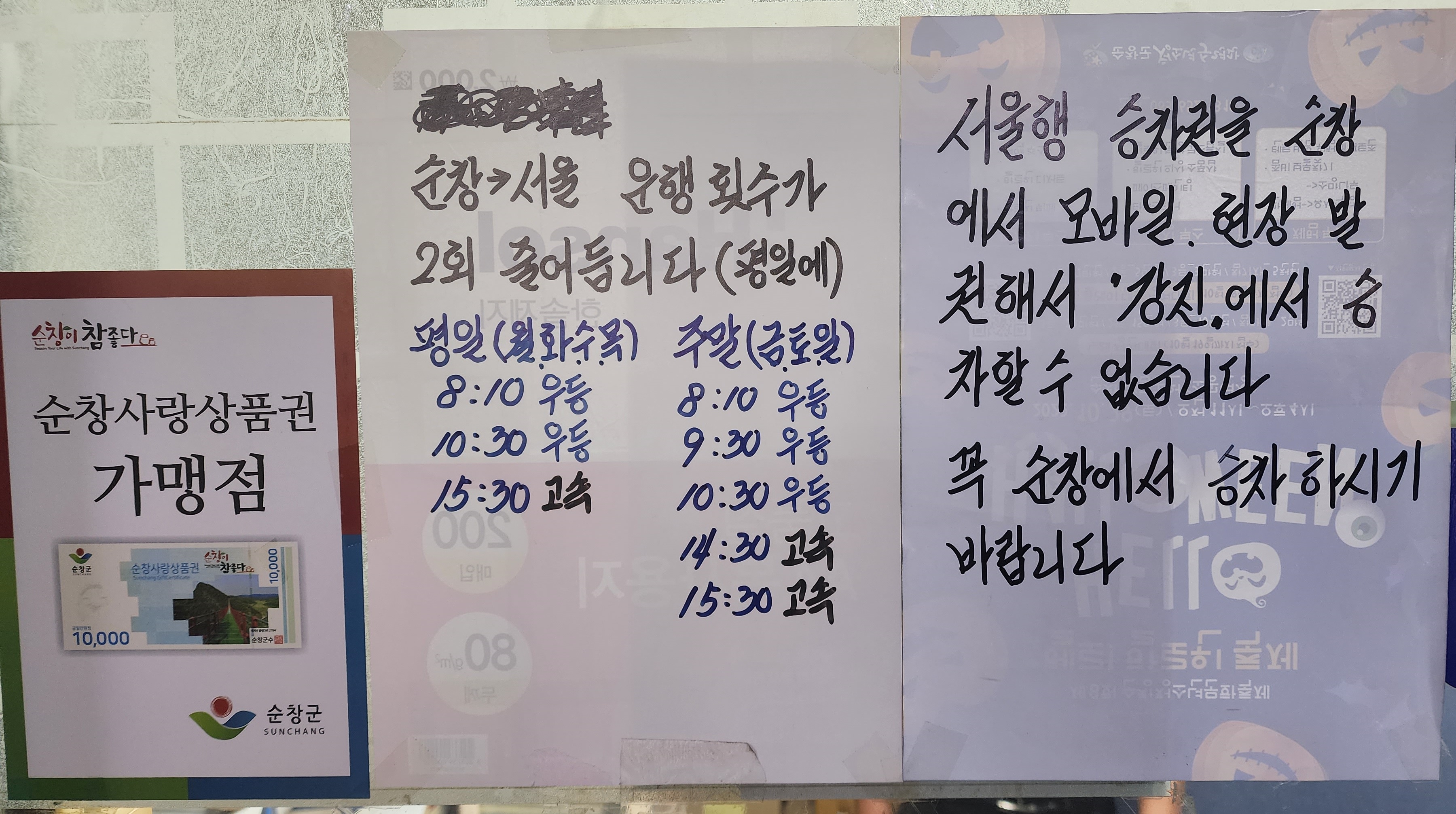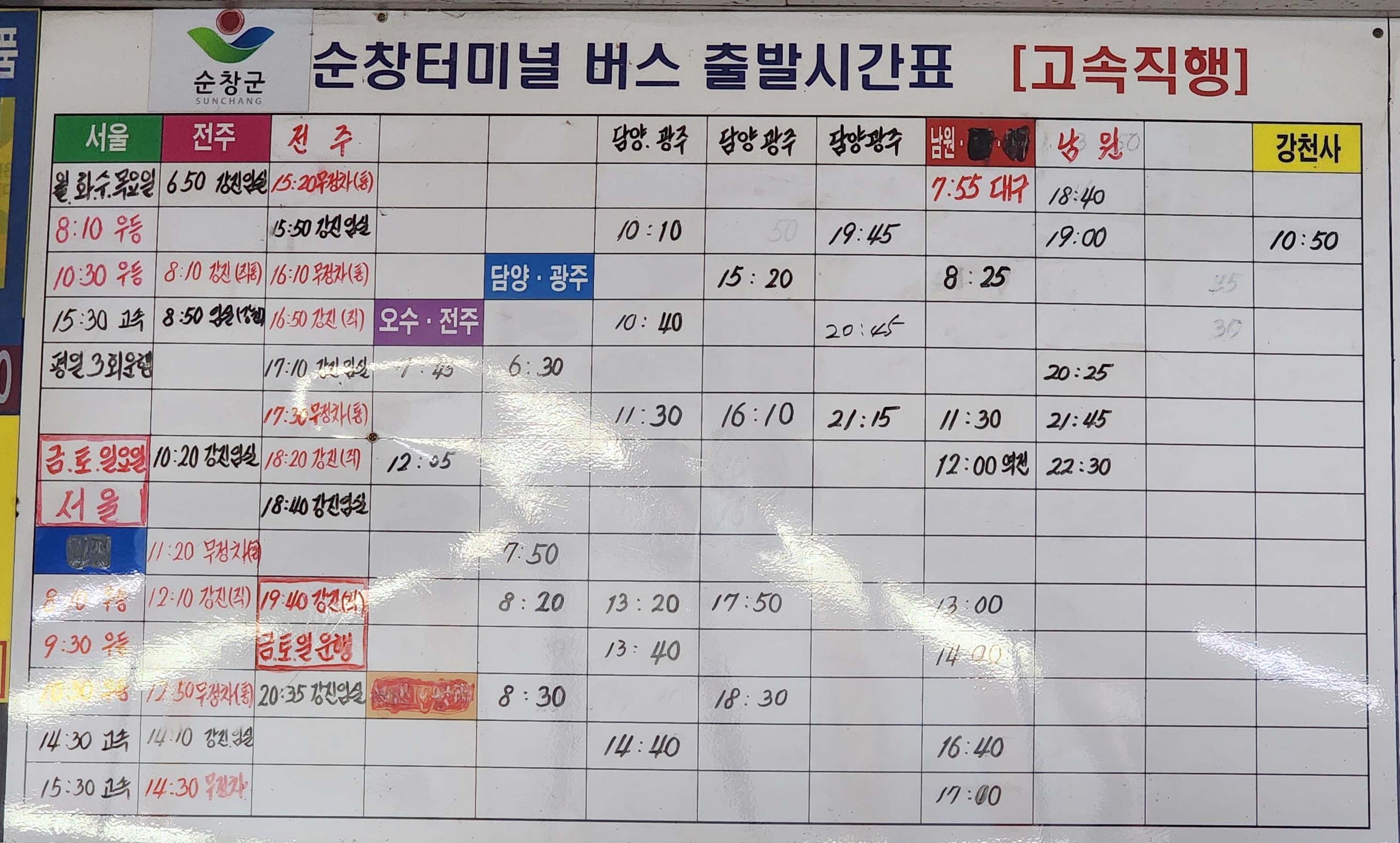 순창 출발 서울, 전주, 오수, 담양, 광주, 남원, 강천사 방면.