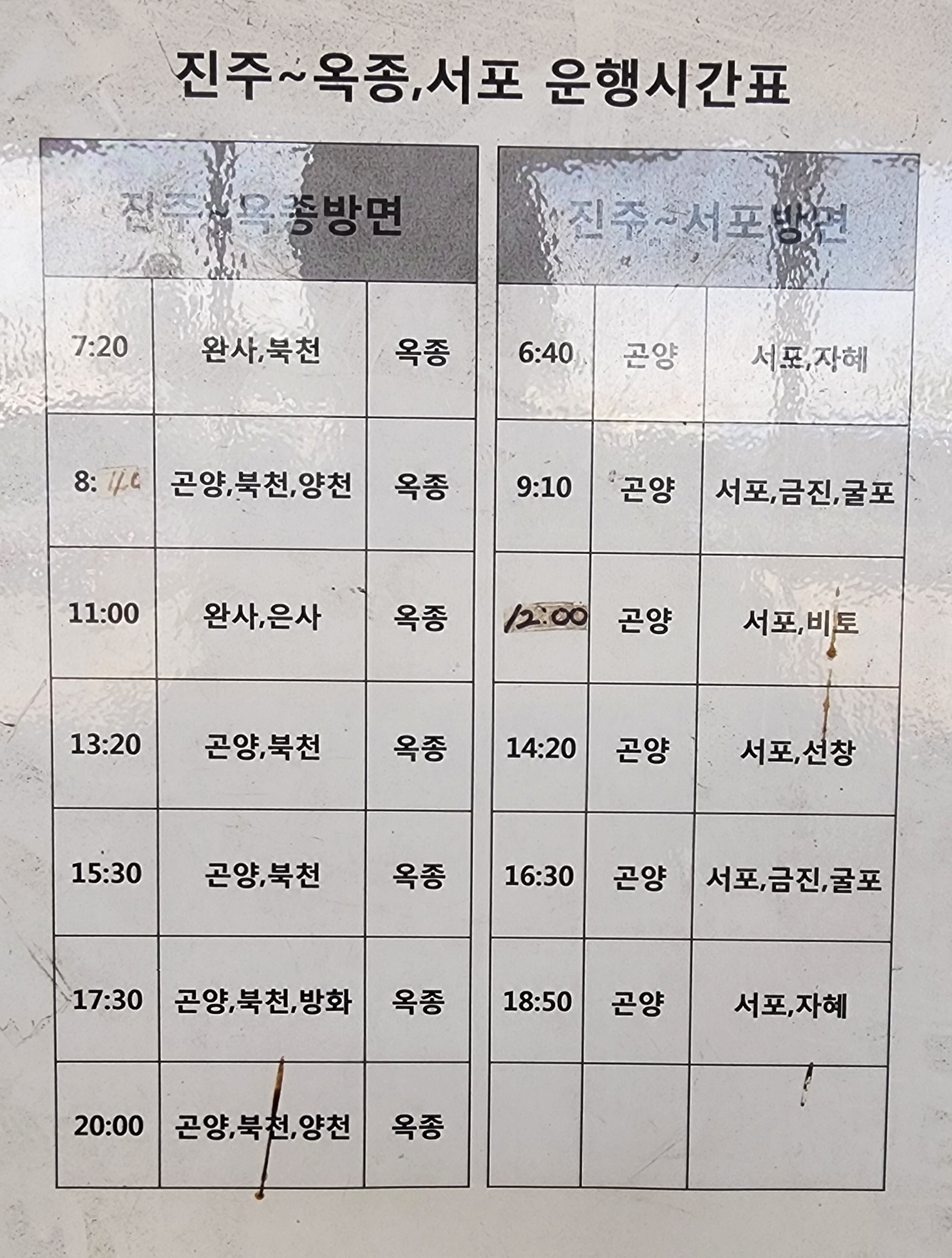 진주 출발 중산리, 청계리, 관정, 대원사, 홍계, 가회, 대병, 완사, 곤양, 옥종, 북천, 서포, 서울 남부터미널, 인천 방면.