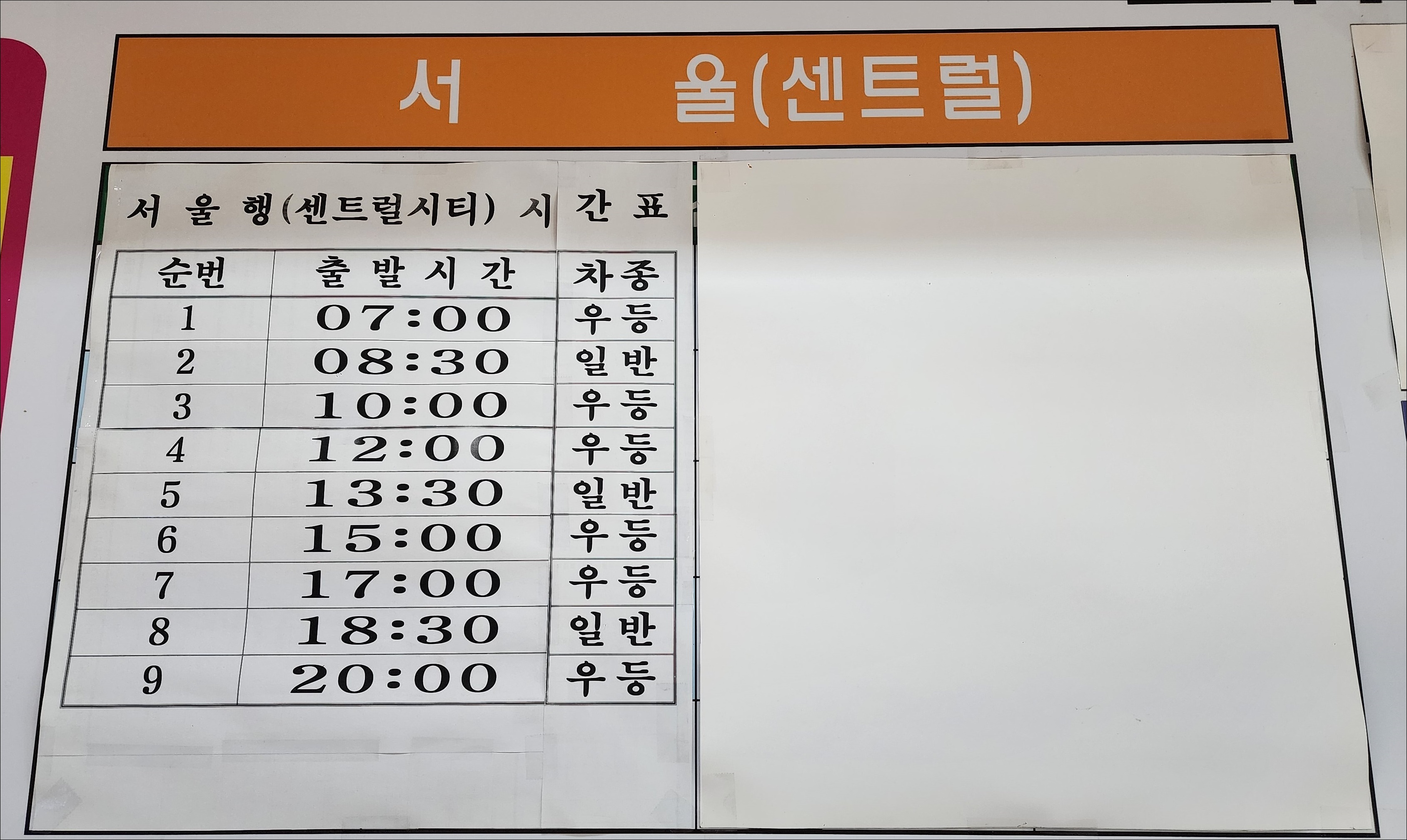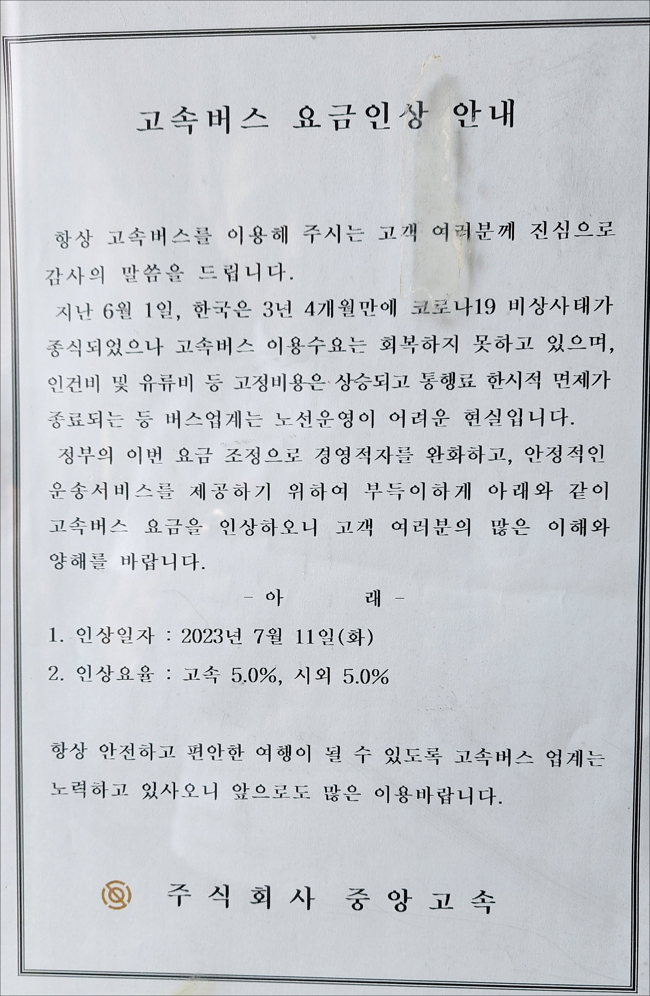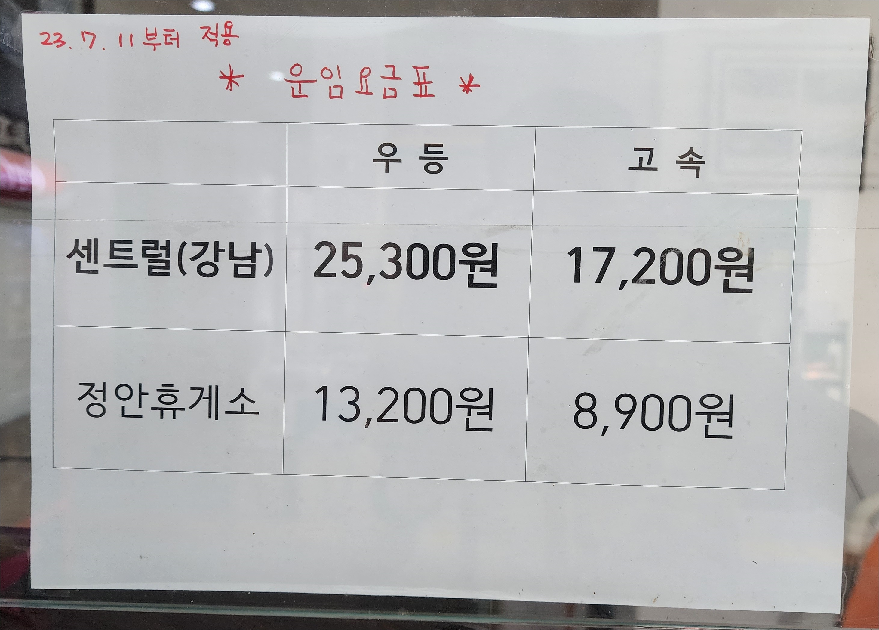 고속버스 요금 인상 안내문 과 인상요금표