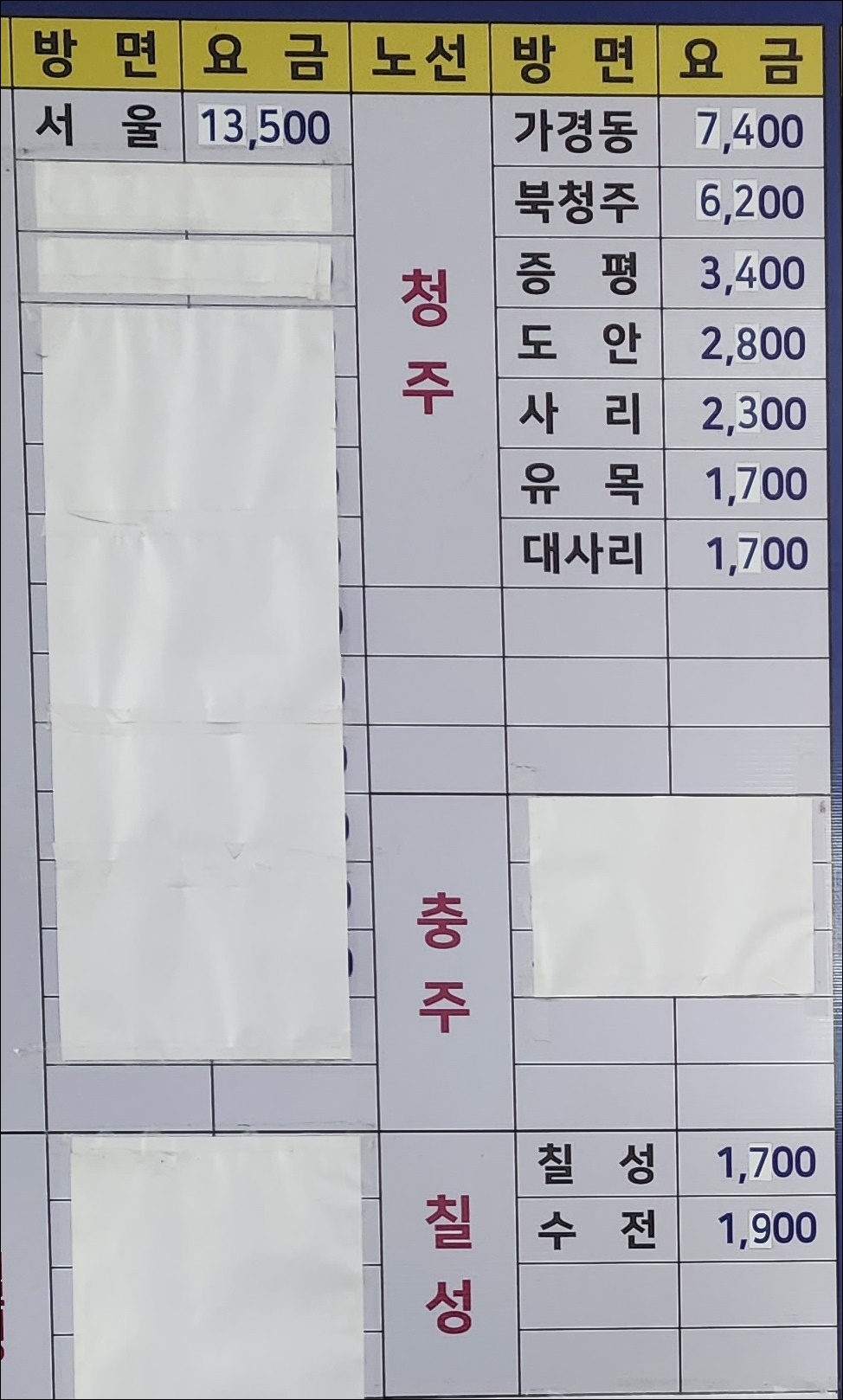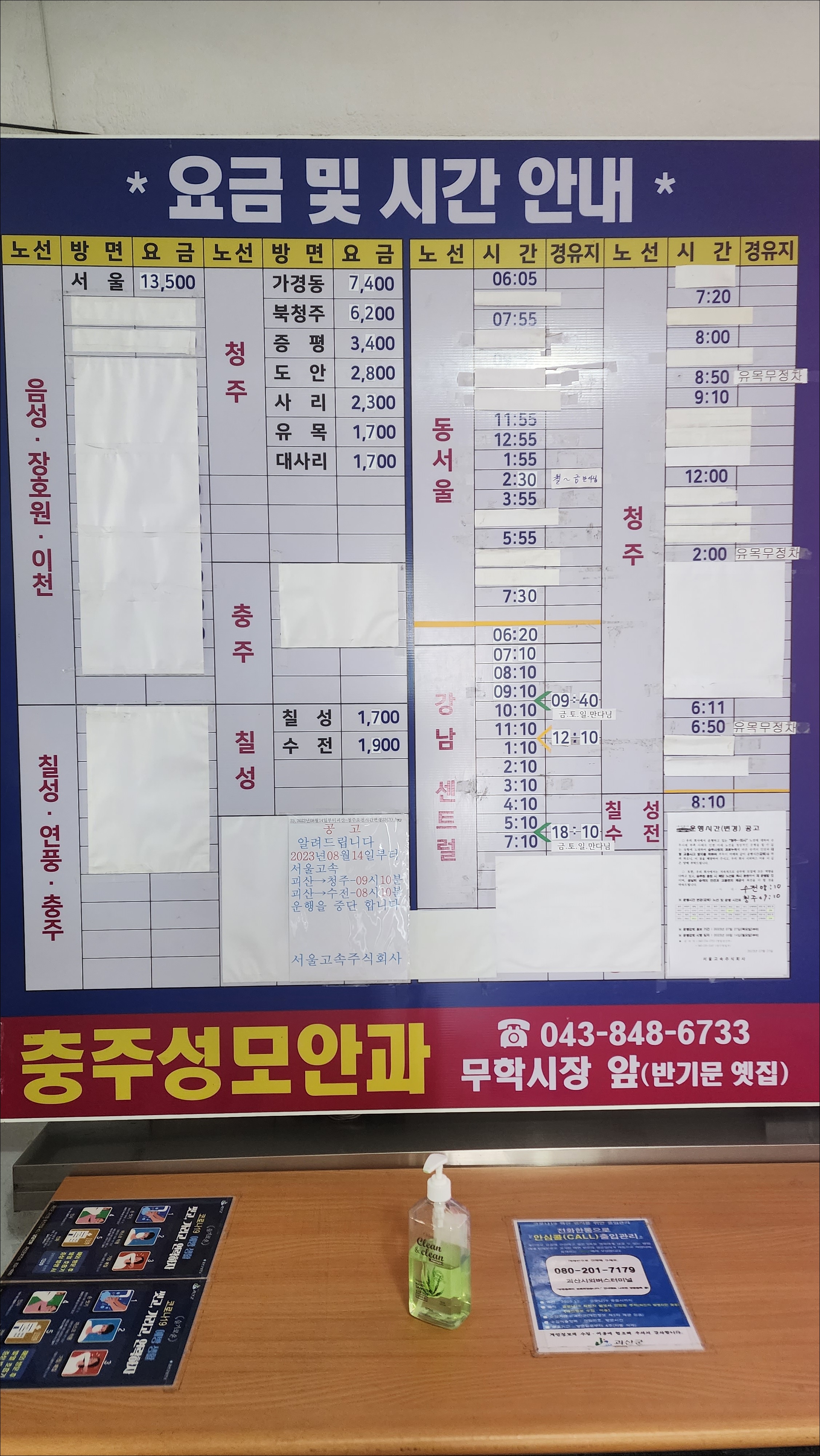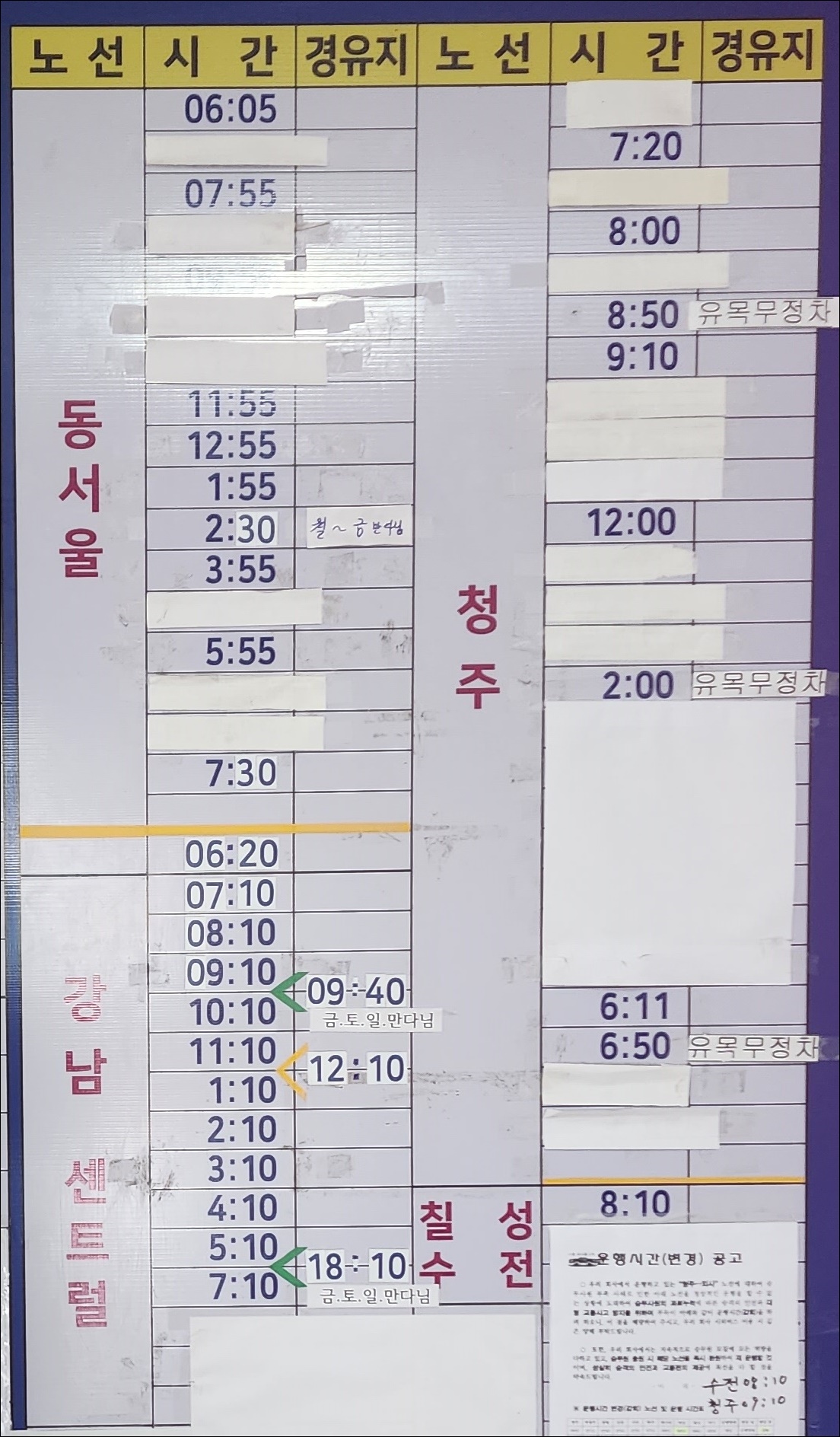 괴산 출발 동서울, 강남센트럴, 청주, 칠성, 수전 방면.
