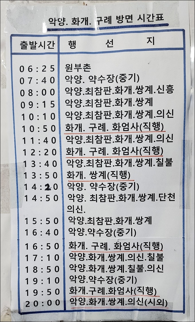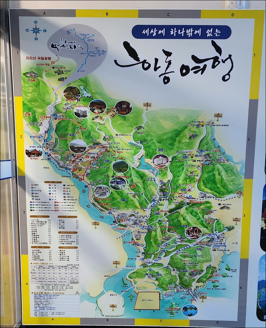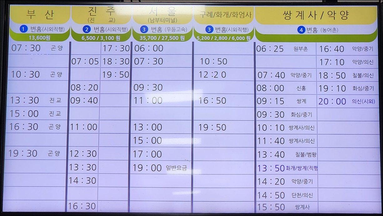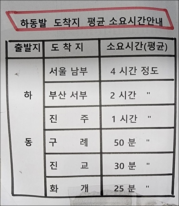 하동 출발 부산, 진주, 서울, 구례, 화개, 화엄사, 쌍계사, 악양 방면.