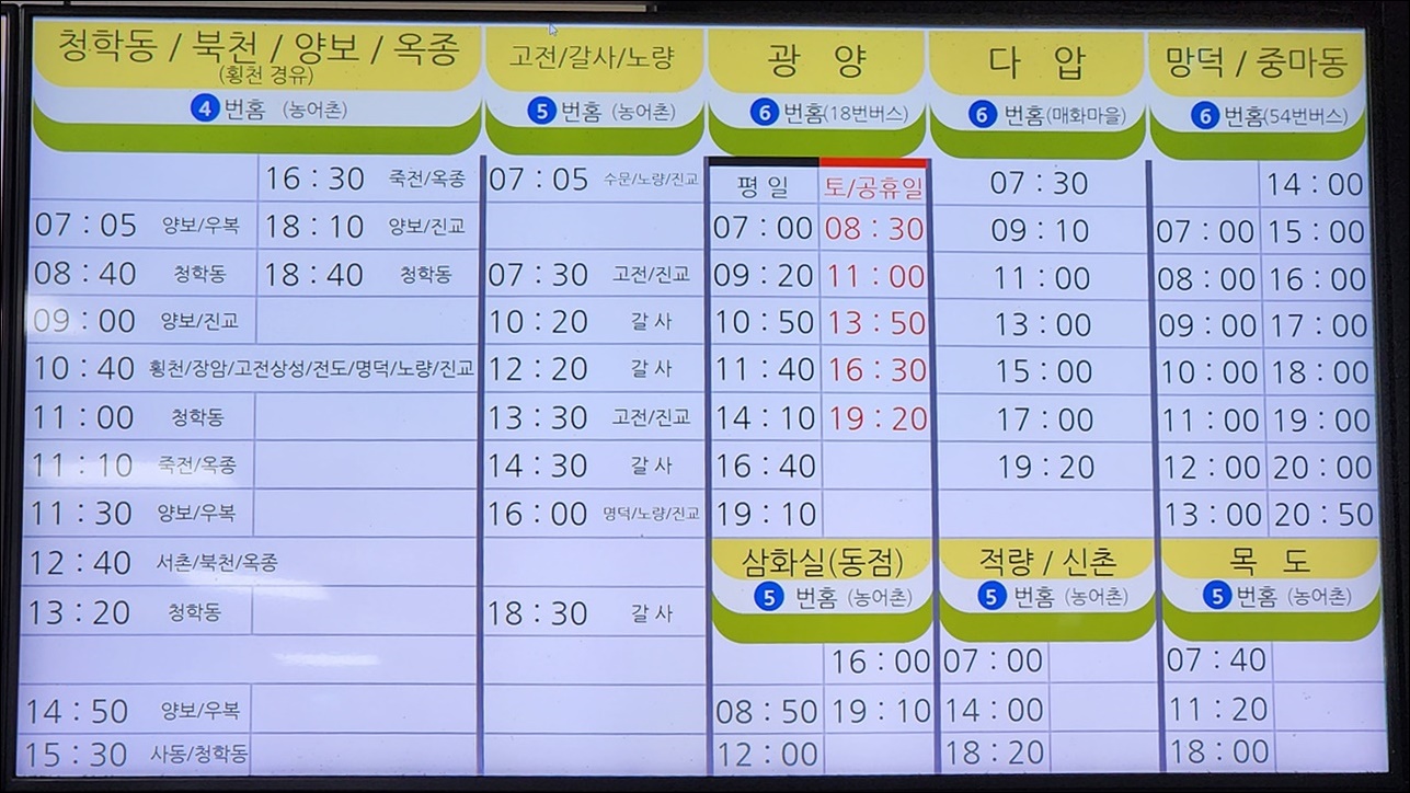 하동 출발 청학동, 북천, 양보, 옥종, 고전, 갈사, 노량, 광양, 다압, 망덕, 중마동 방면.