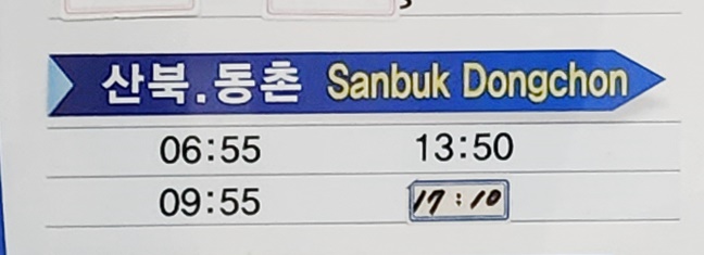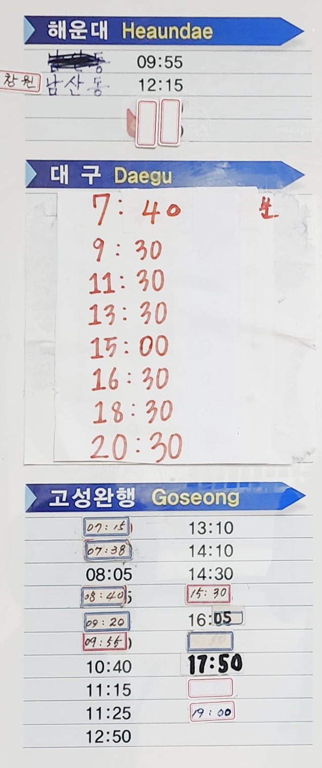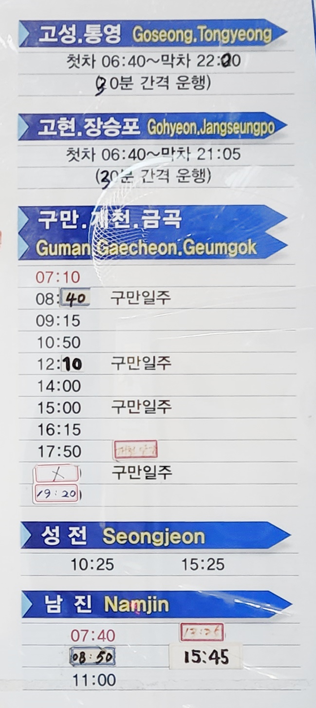 배둔 출발 고성, 통영, 고현, 장승포, 구만, 개천, 금곡,성전, 남진 방면.