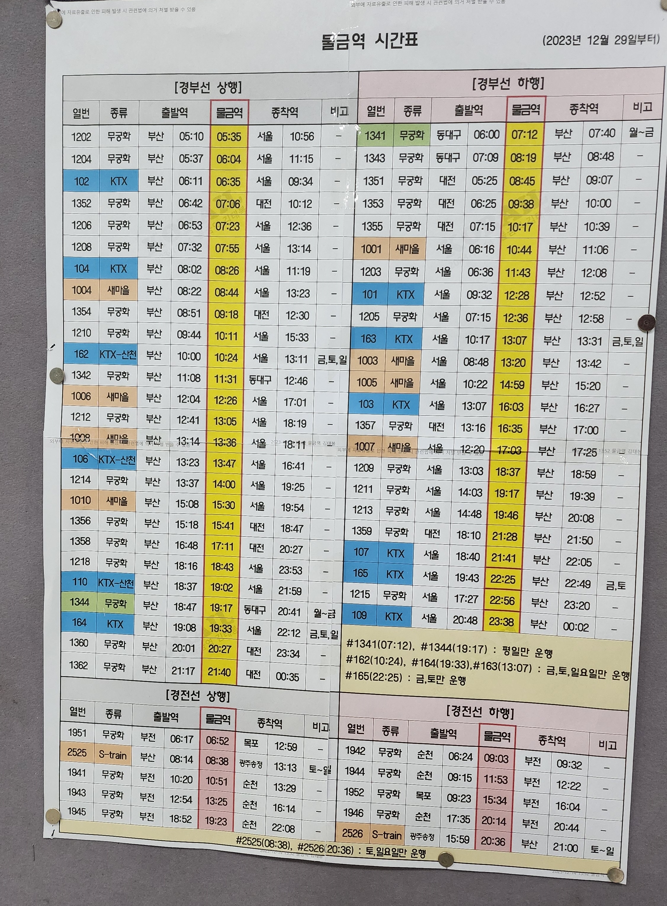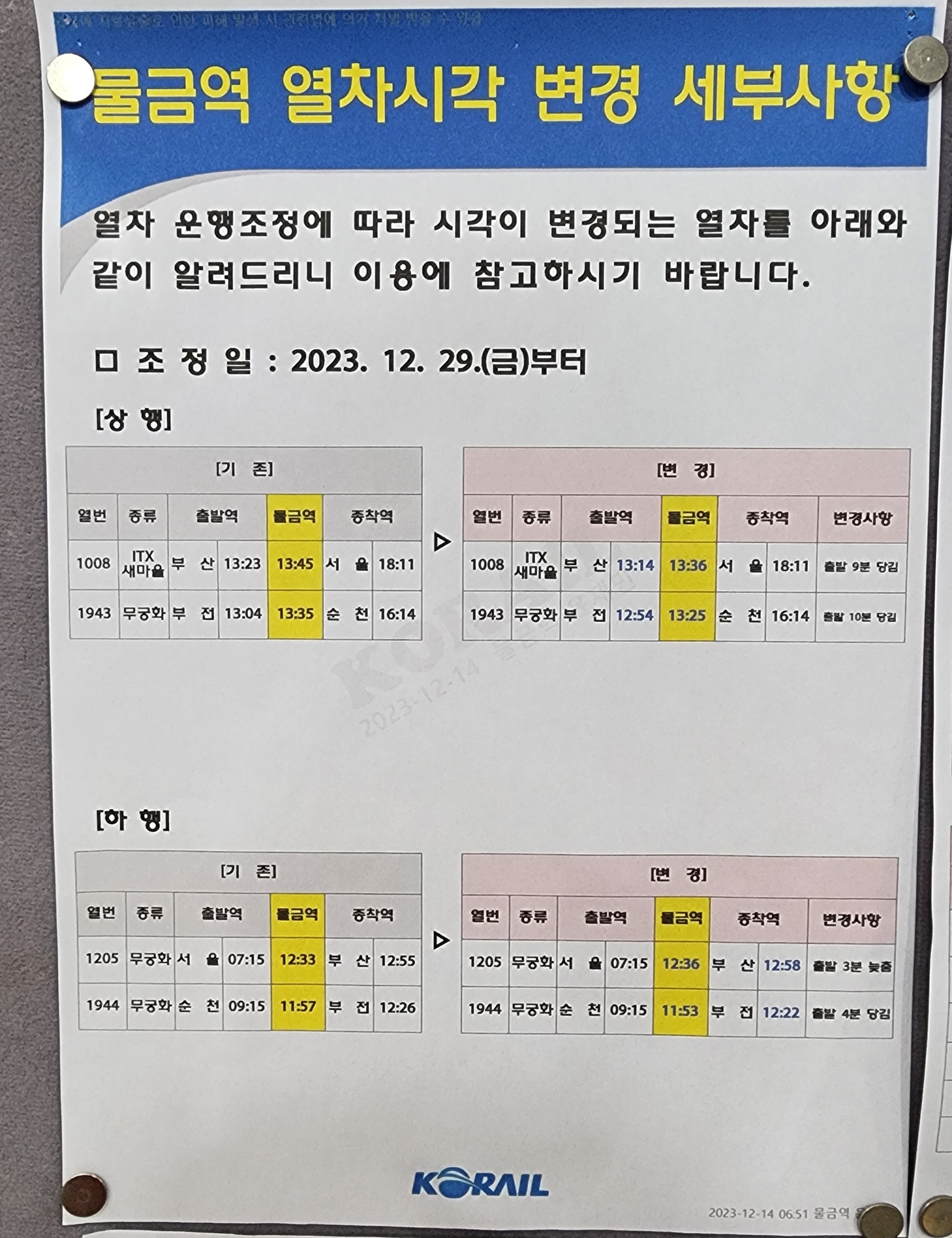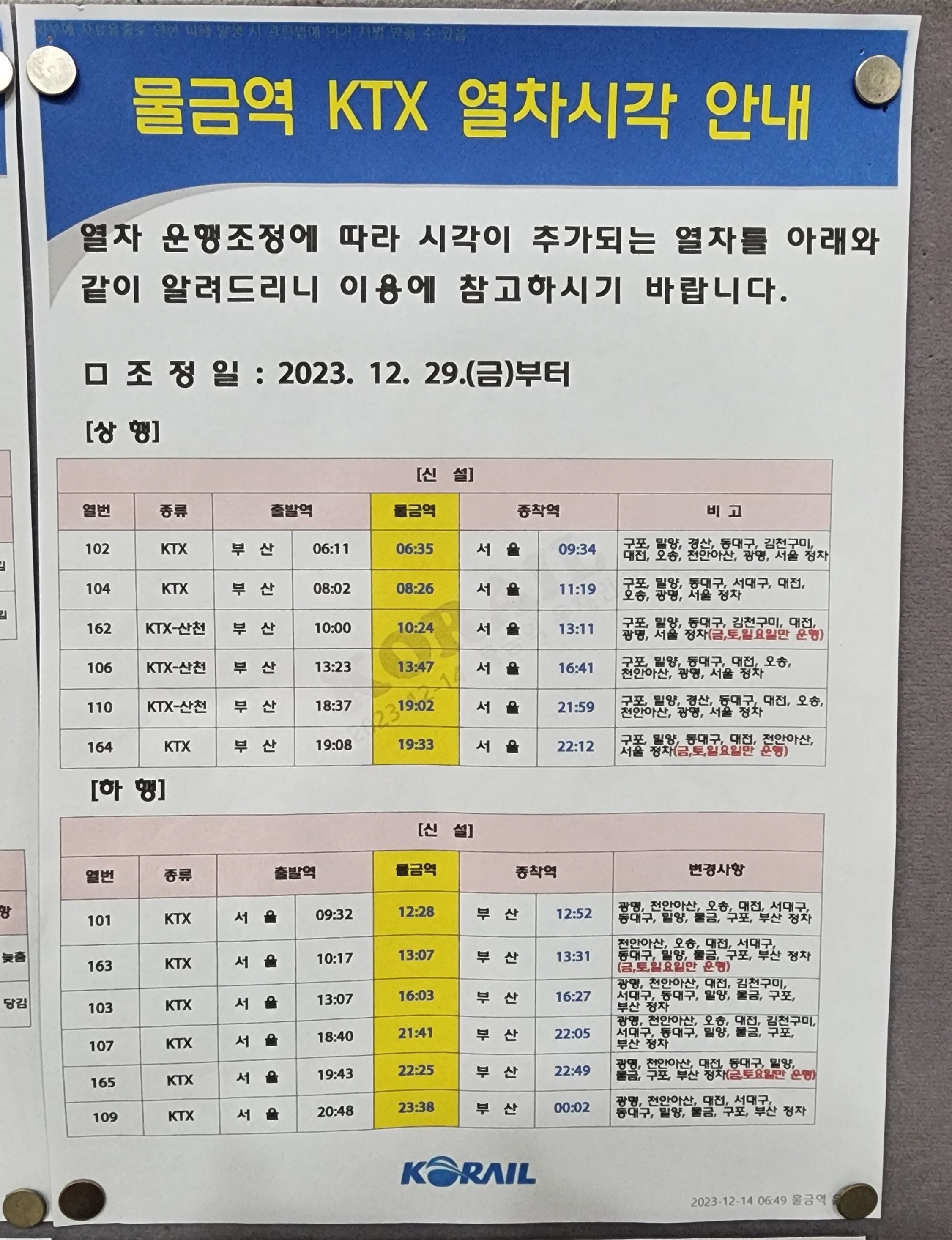 2023년 12월 29일(금) 부터 열차 운행조정에 따라 시각이 추가되는 열차시간표입니다.