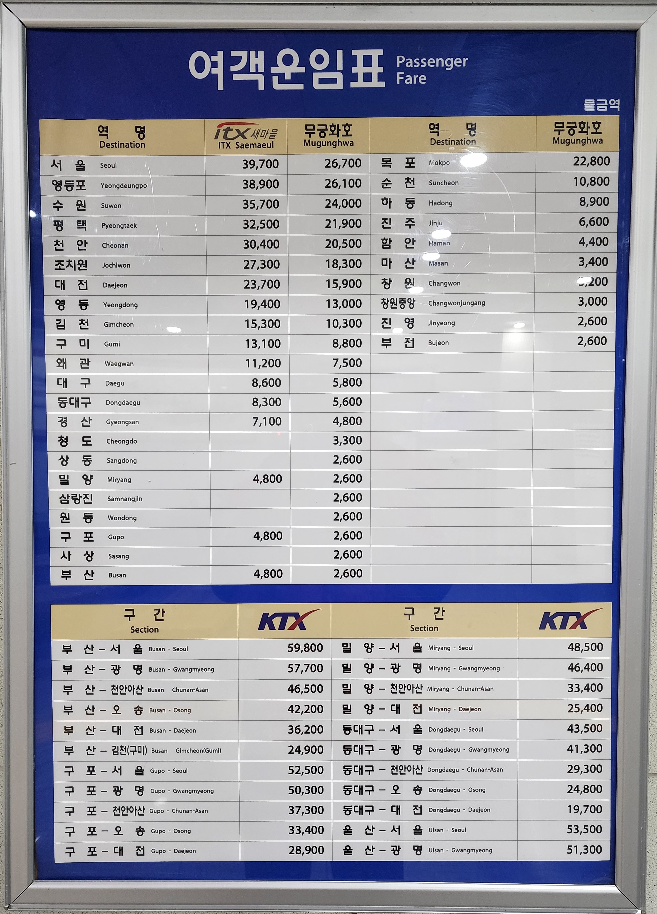 물금역 출발 여객운임표