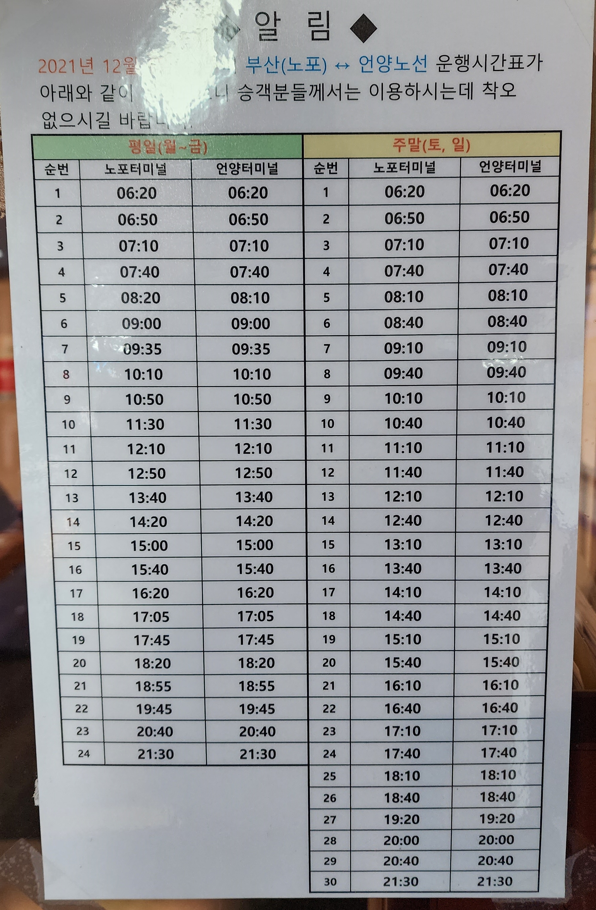 언양 출발 부산 노포 시간표