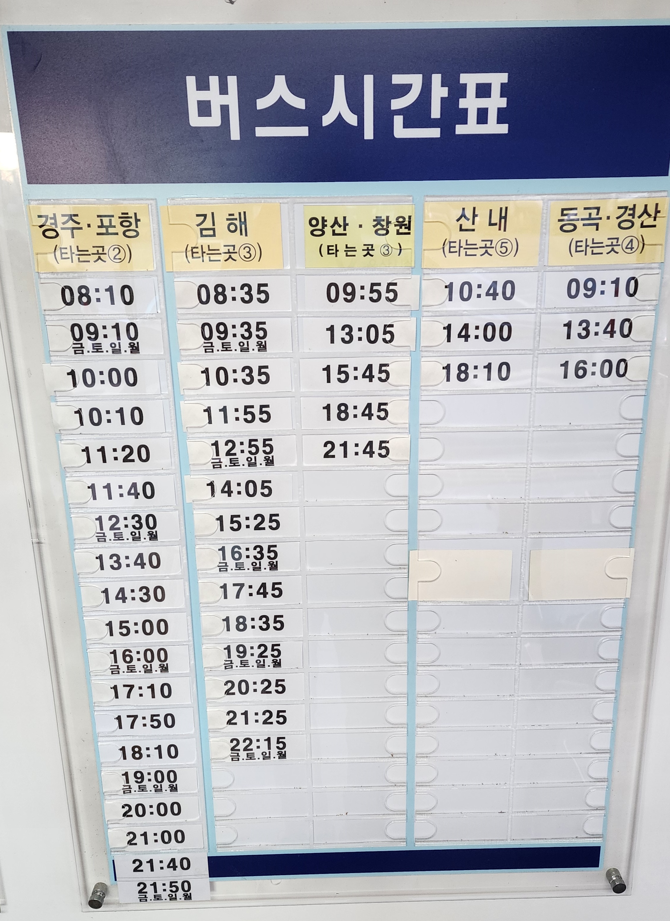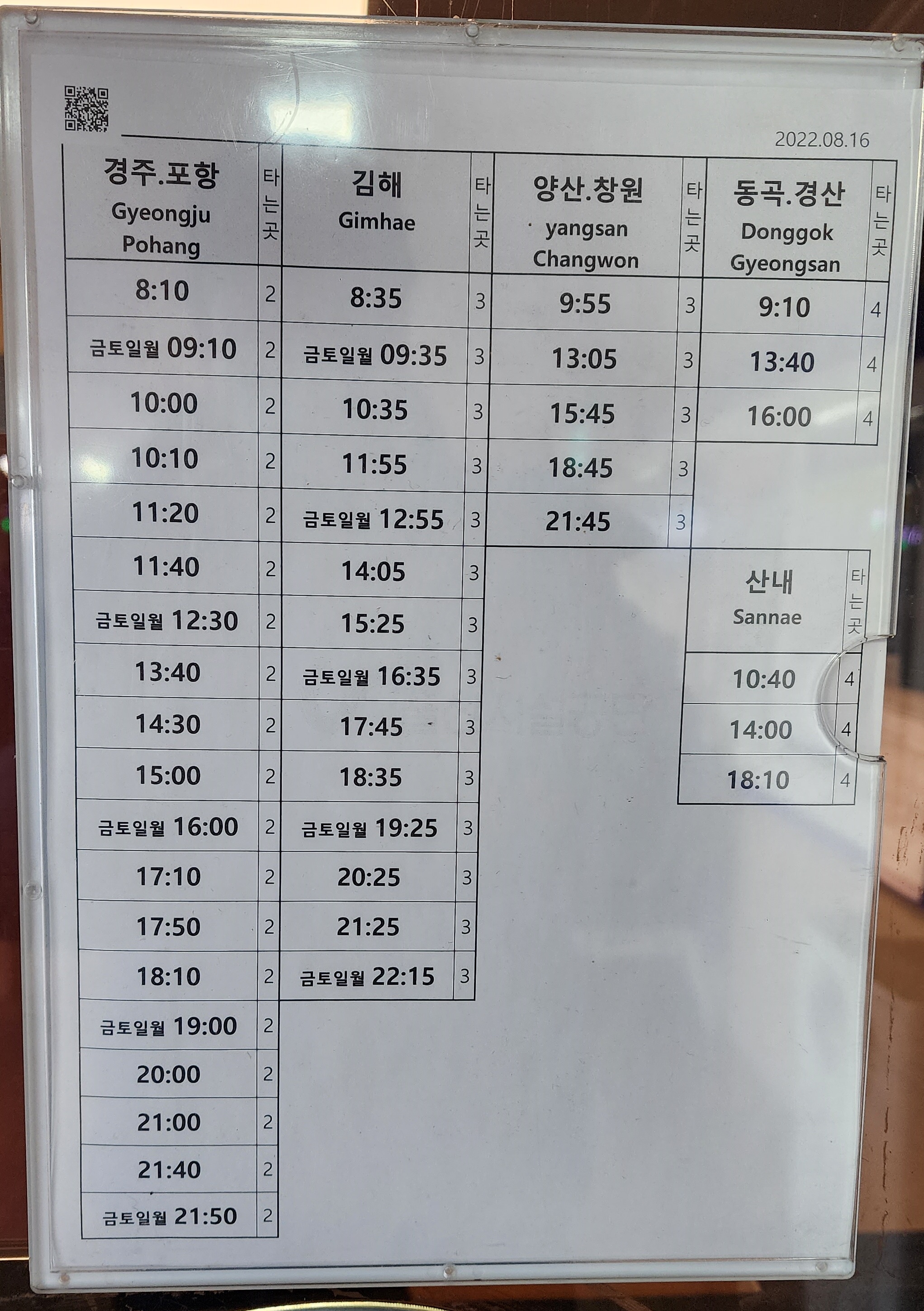 언양 출발 경주, 포항, 김해, 양산, 창원, 산내 ,동곡, 경산 방면 시간표