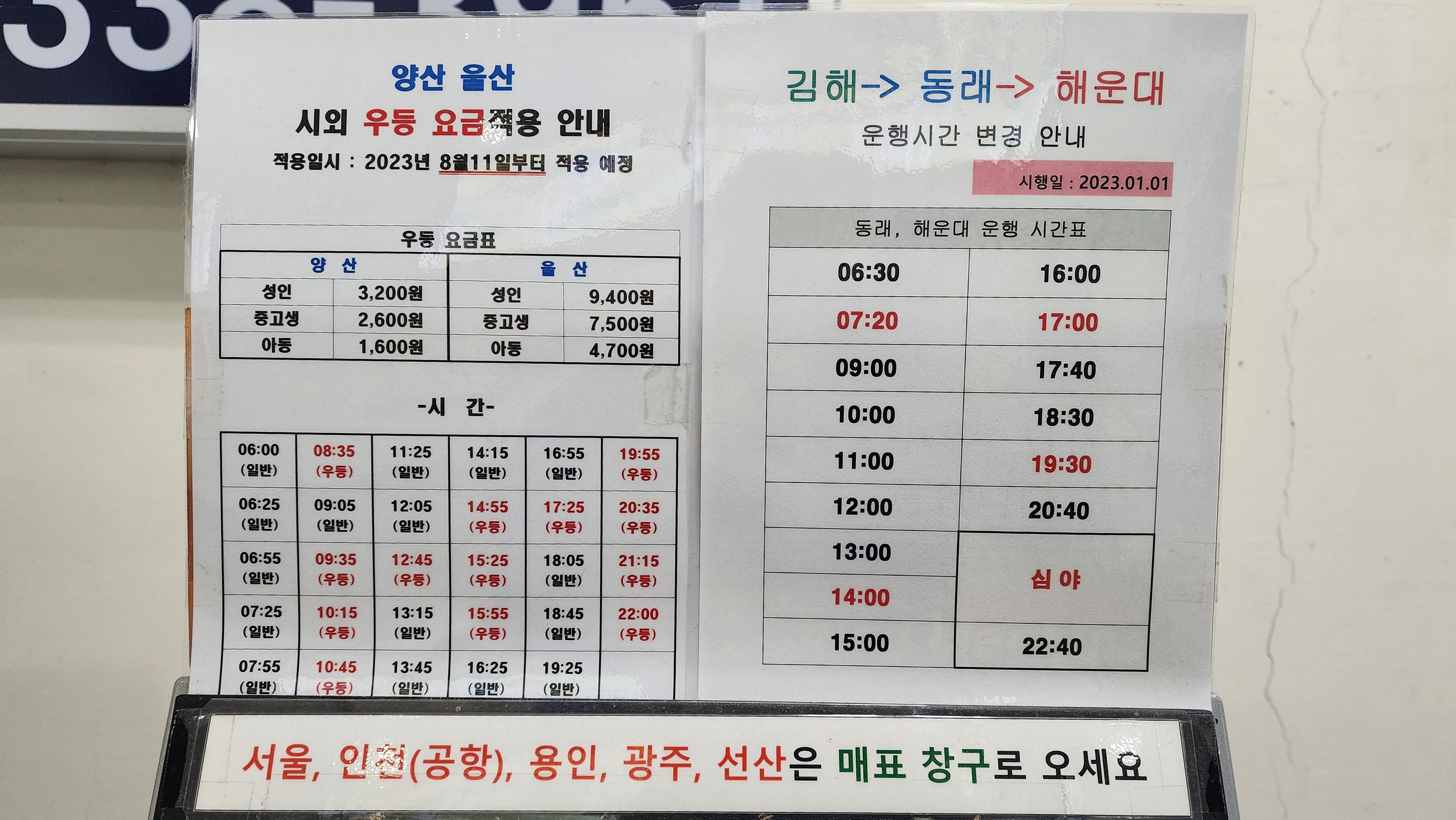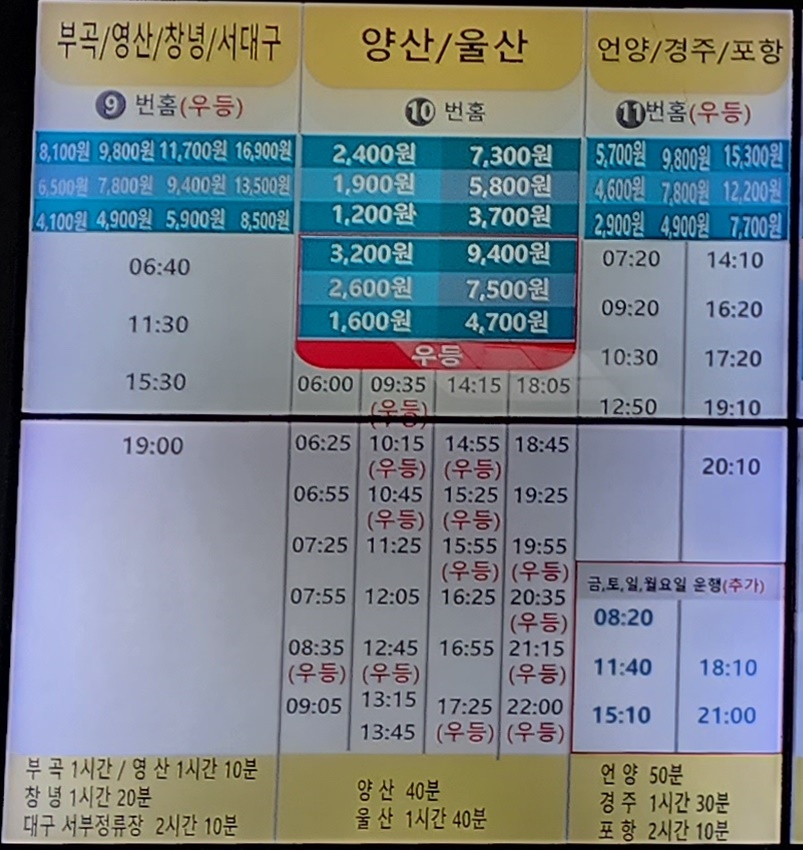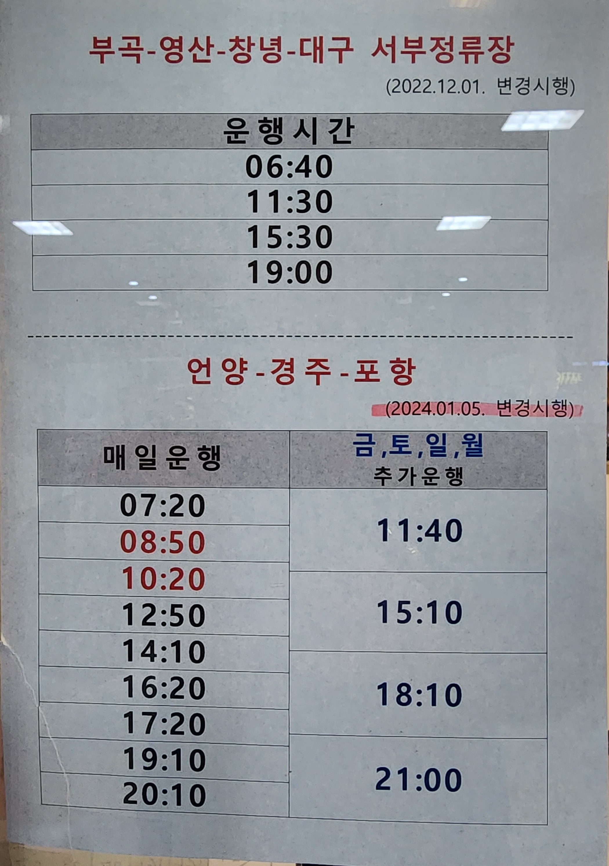 김해 출발 부곡, 영산, 창녕, 대구 서부정류장, 언양, 경주, 포항 시간표.