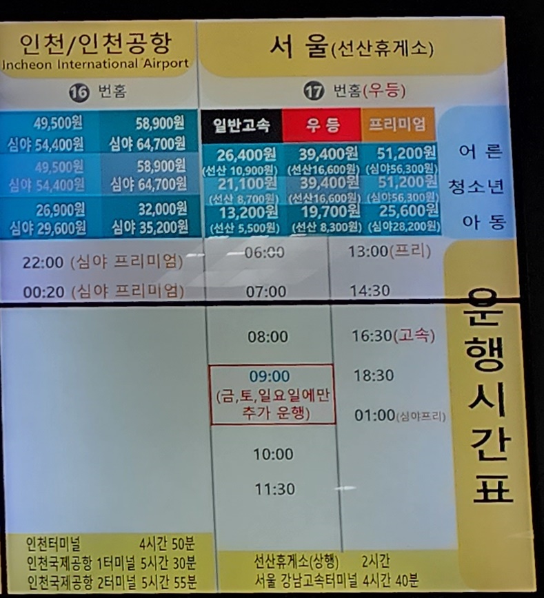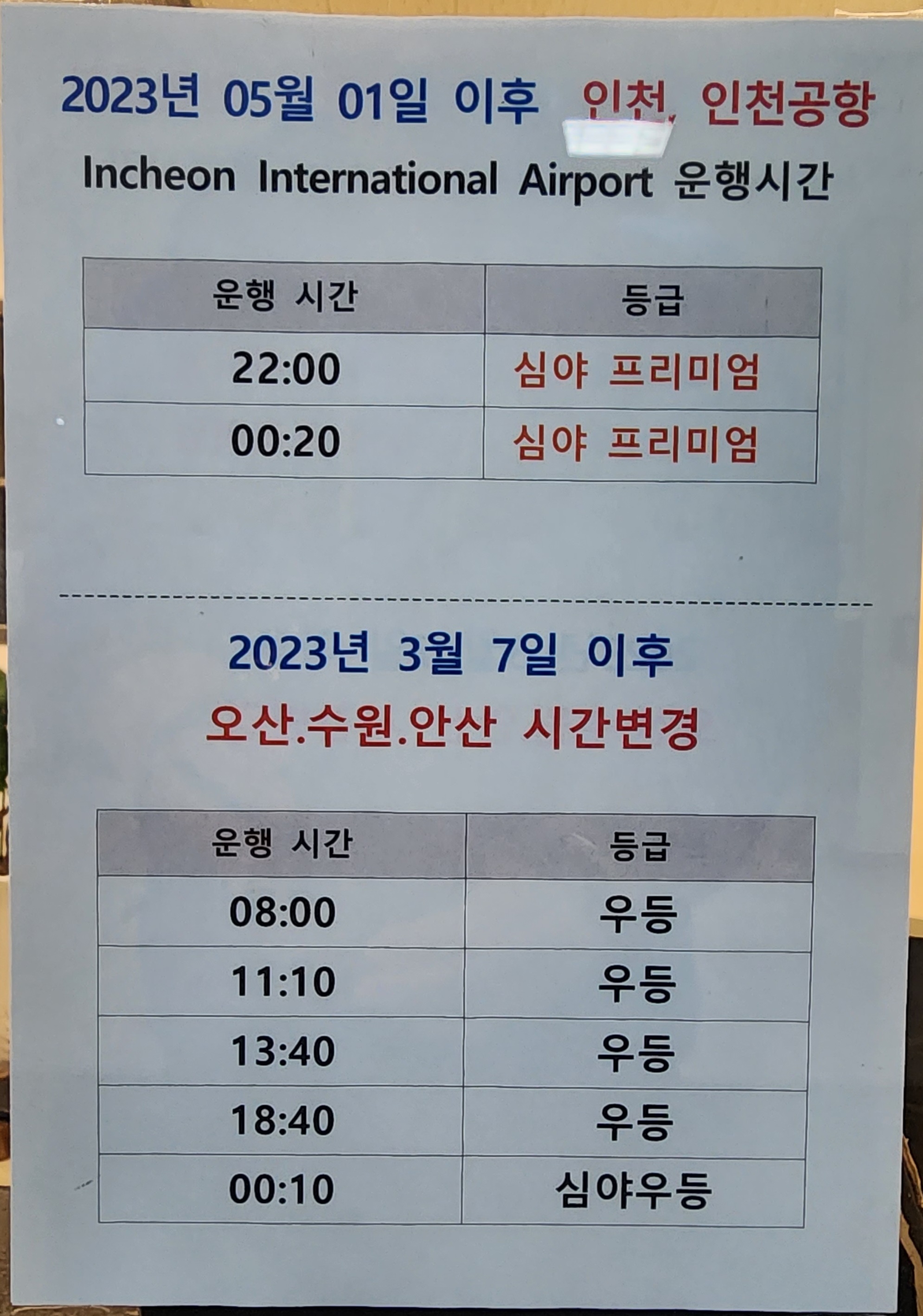 김해 출발 인천, 인천공항, 오산, 수원, 안산 시간표.