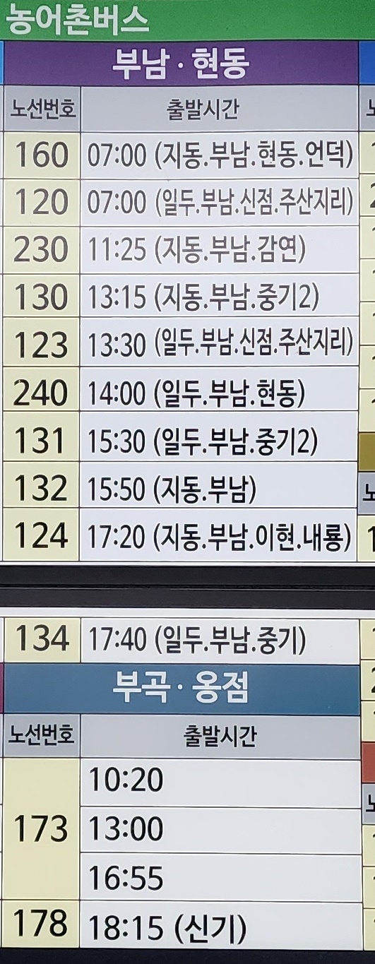 청송 출발 부남, 현동, 부곡, 옹점 방면.