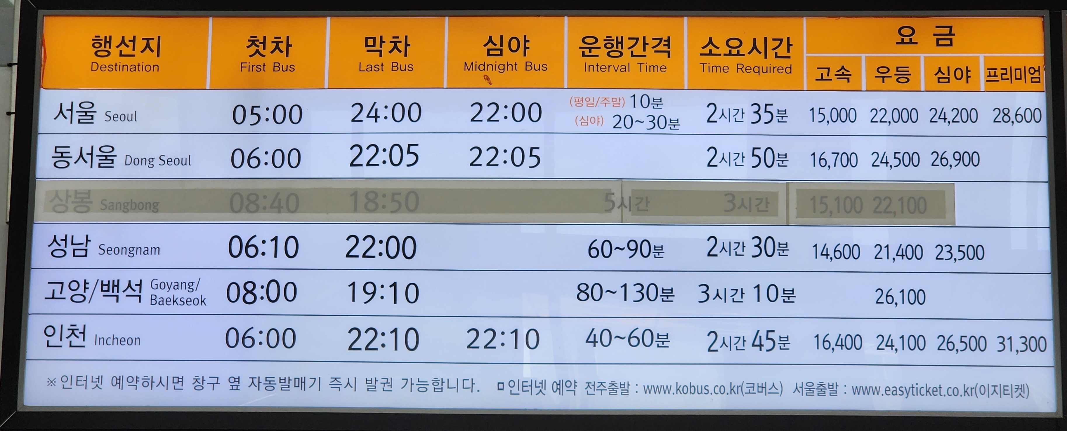 전주 출발 서울, 동서울, 성남, 고양, 백석, 인천 방면.