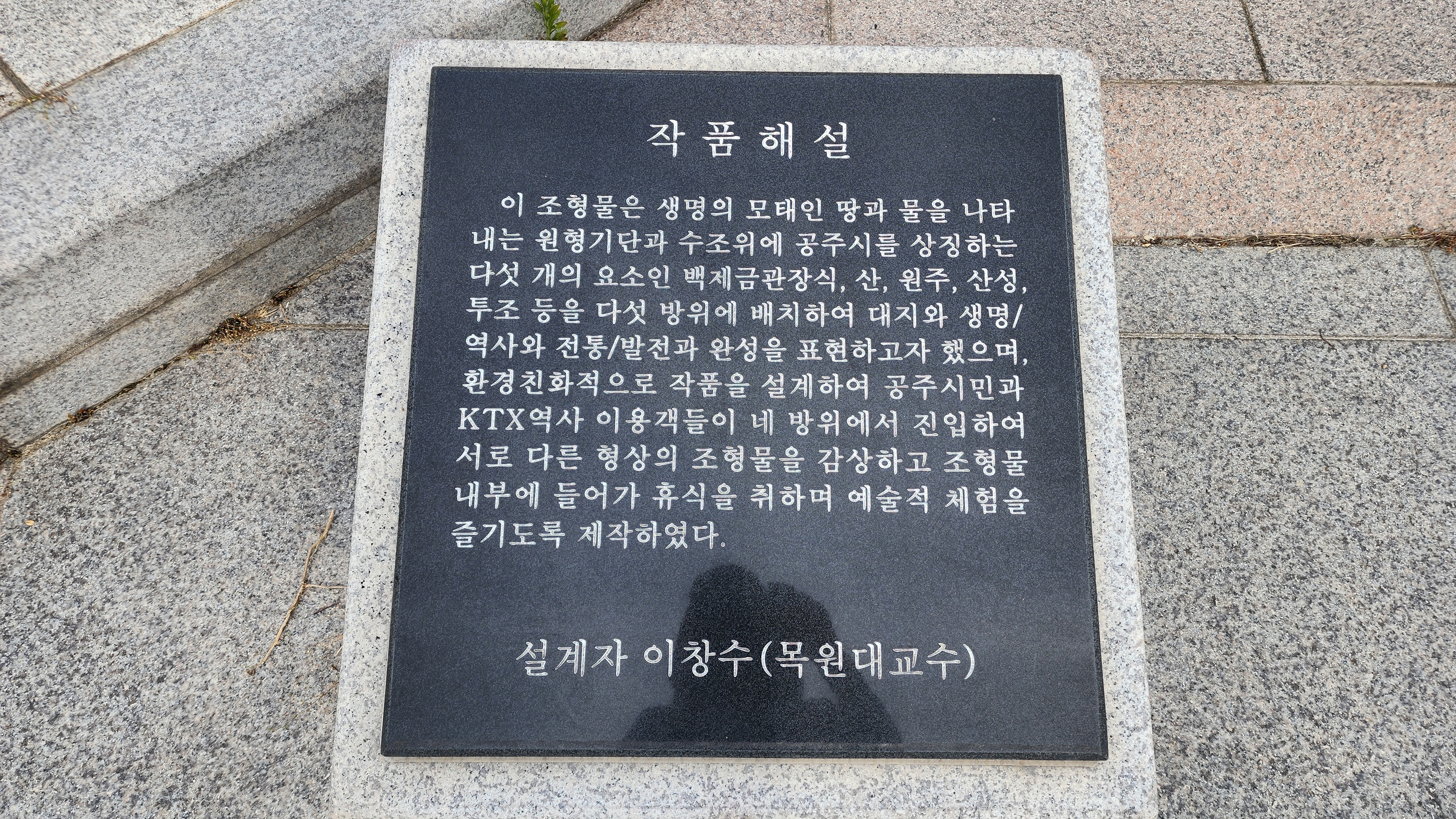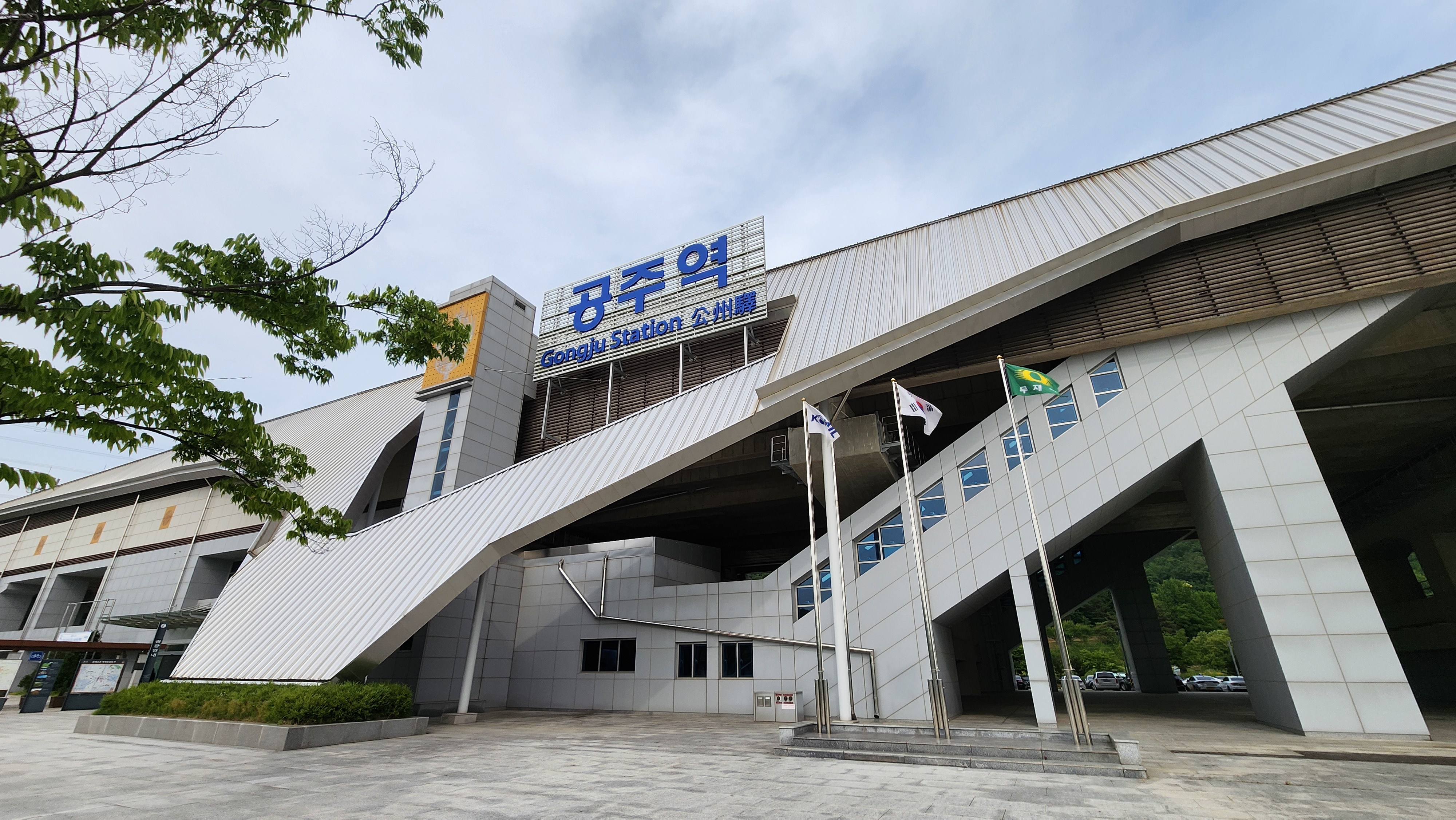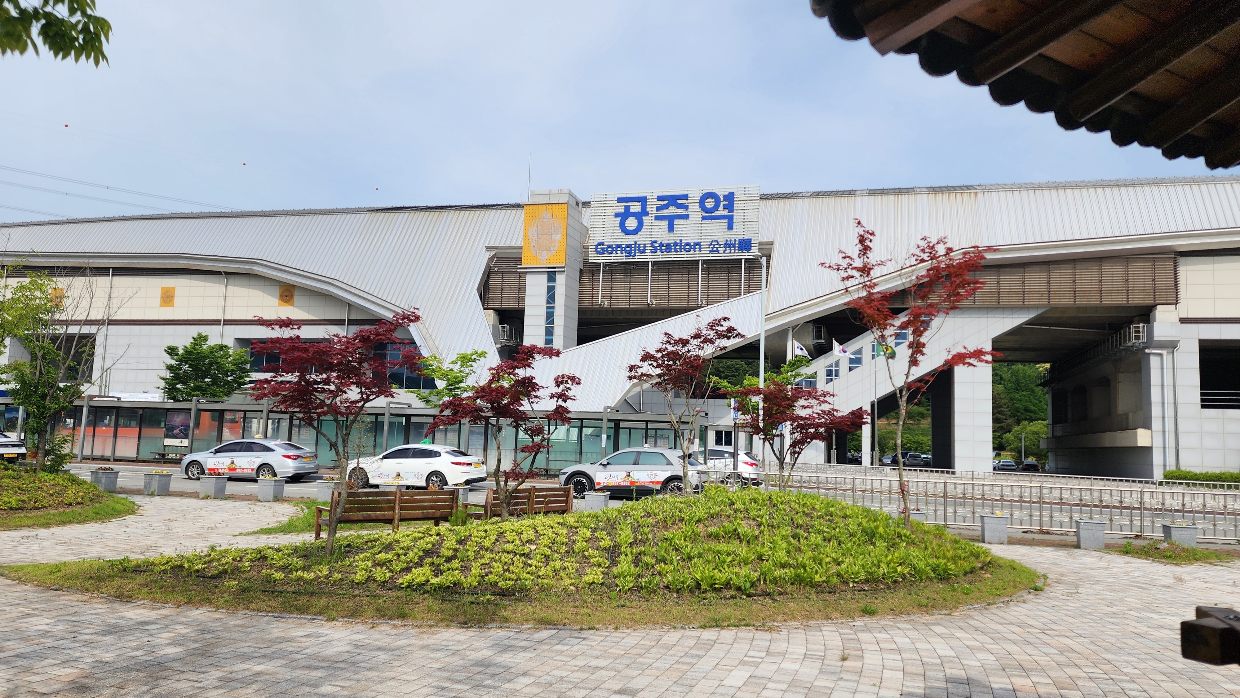 역 광장에는 백제 금관장식과 백제 왕실을 상징하는 대형 조형물이 설치되어 있으며,