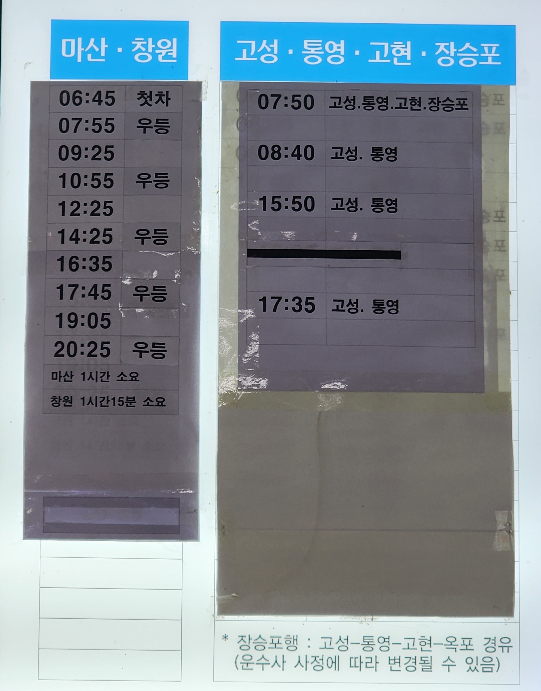 사천 출발 마산, 창원, 고성, 통영, 고현, 장승포 방면.