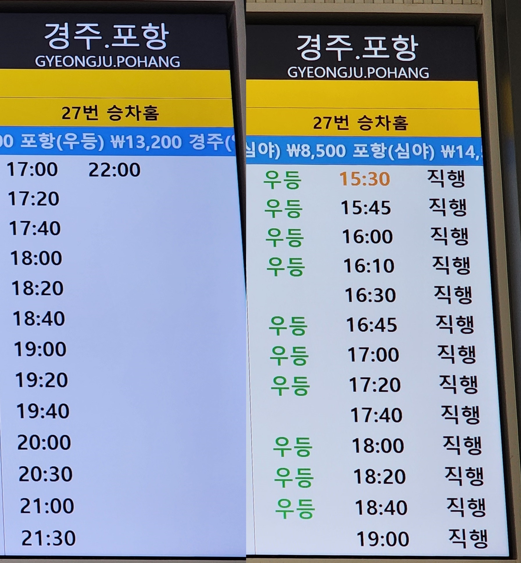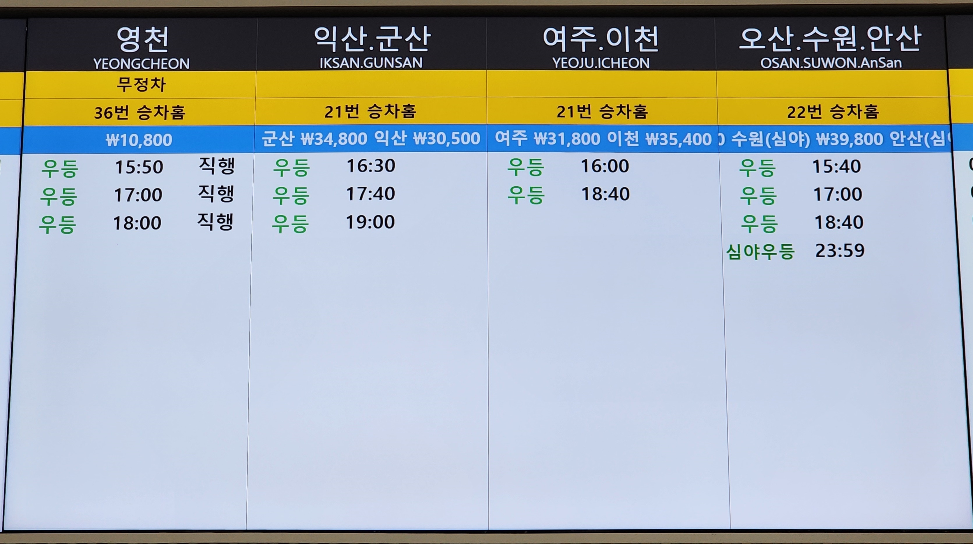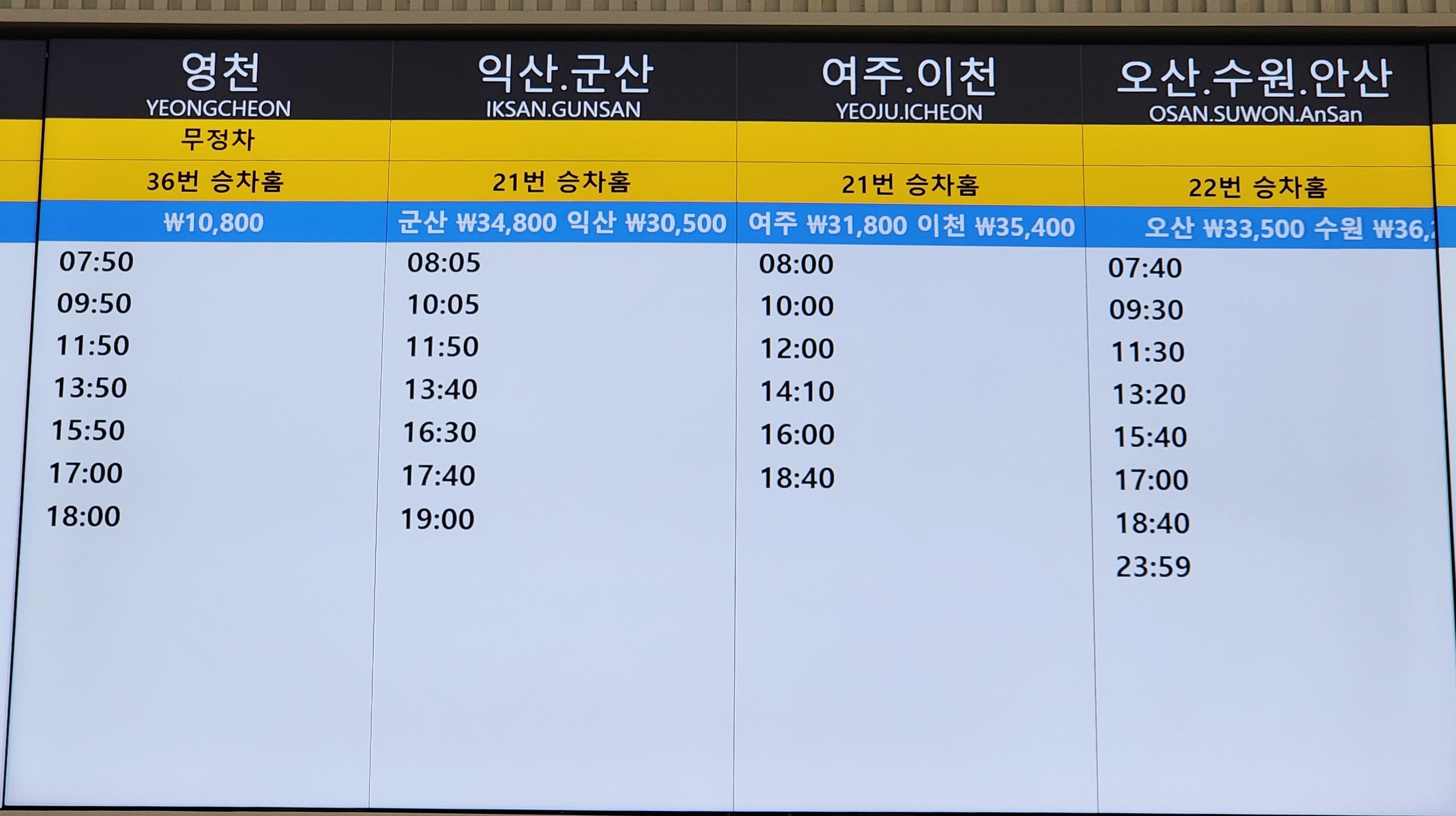 노포 출발 영천, 익산, 군산, 여주, 이천, 오산, 수원, 안산 방면.