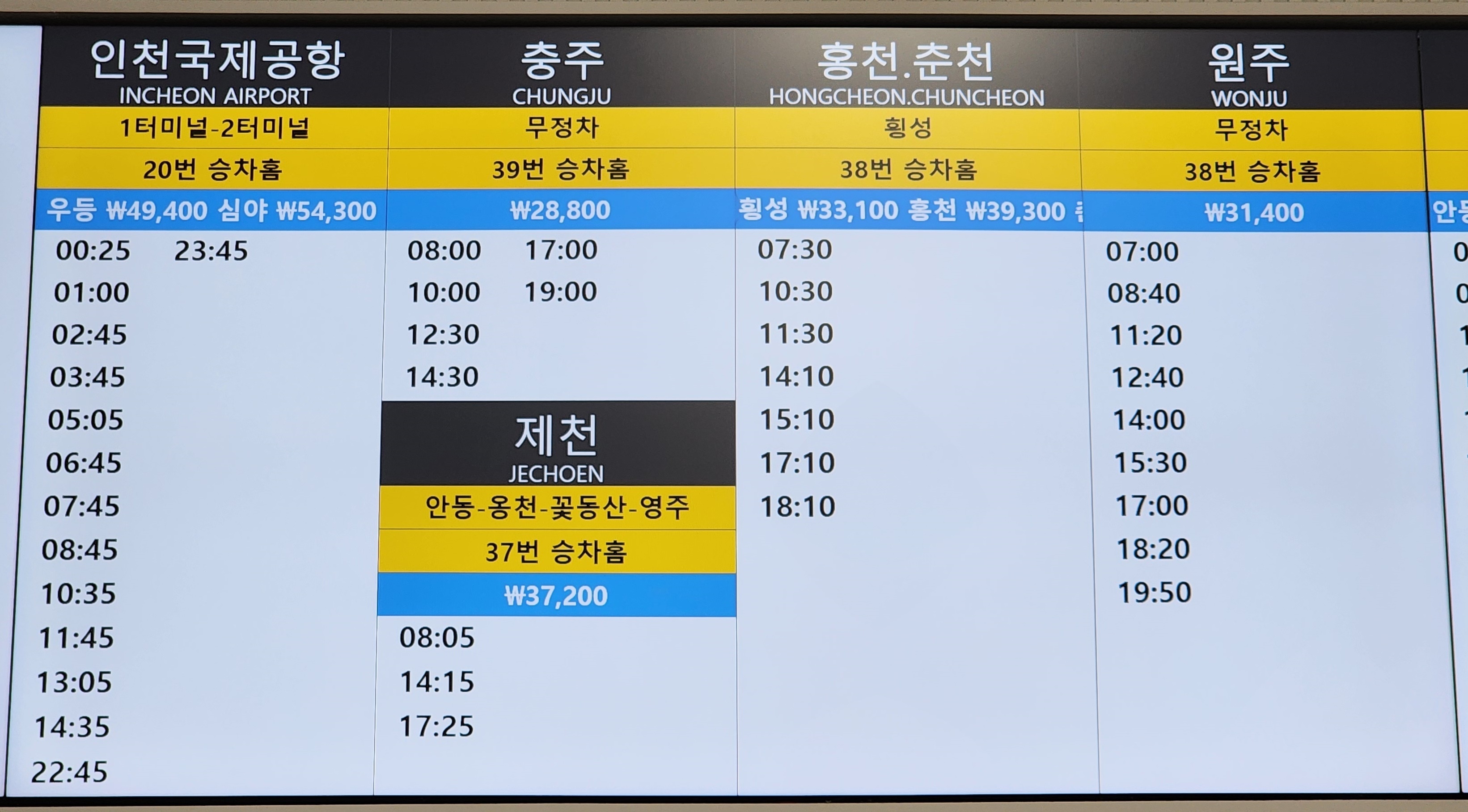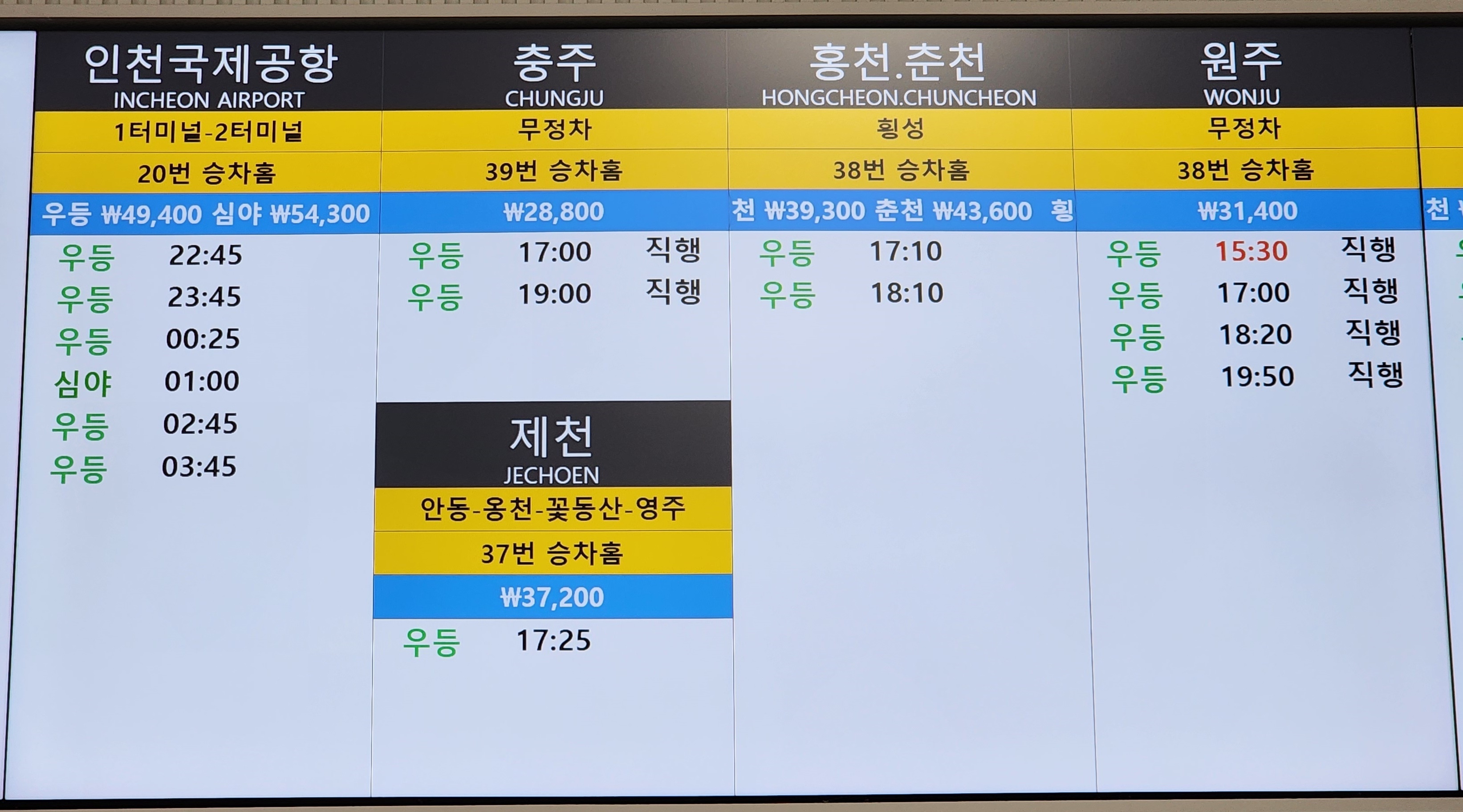 노포 출발 인천국제공항, 충주, 제천, 홍천, 춘천, 원주 방면.