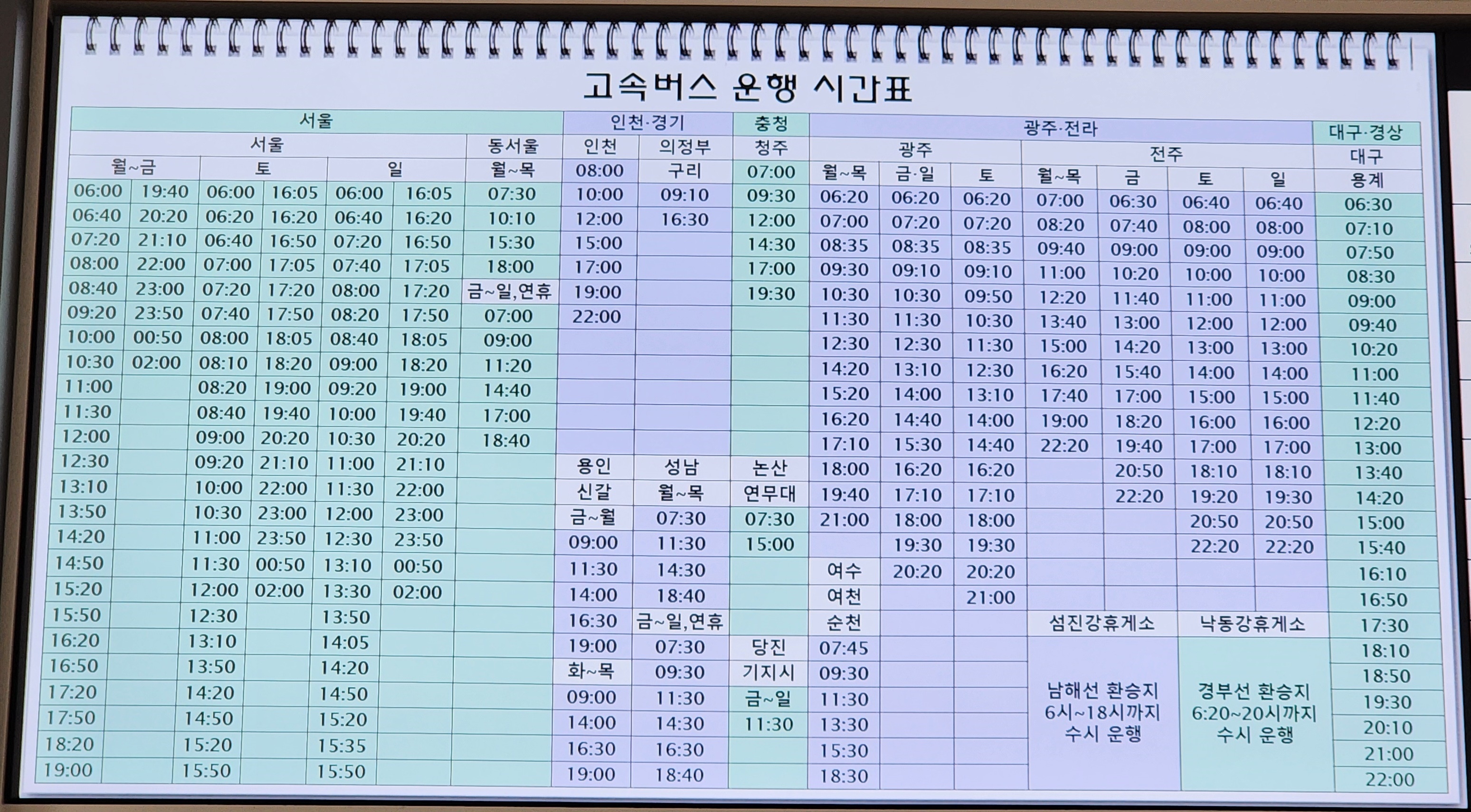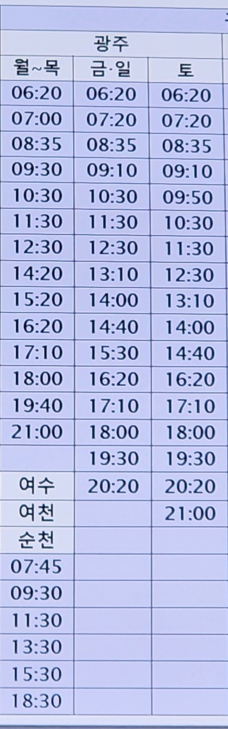 부산 출발 광주, 여수, 여천, 순천 방면.