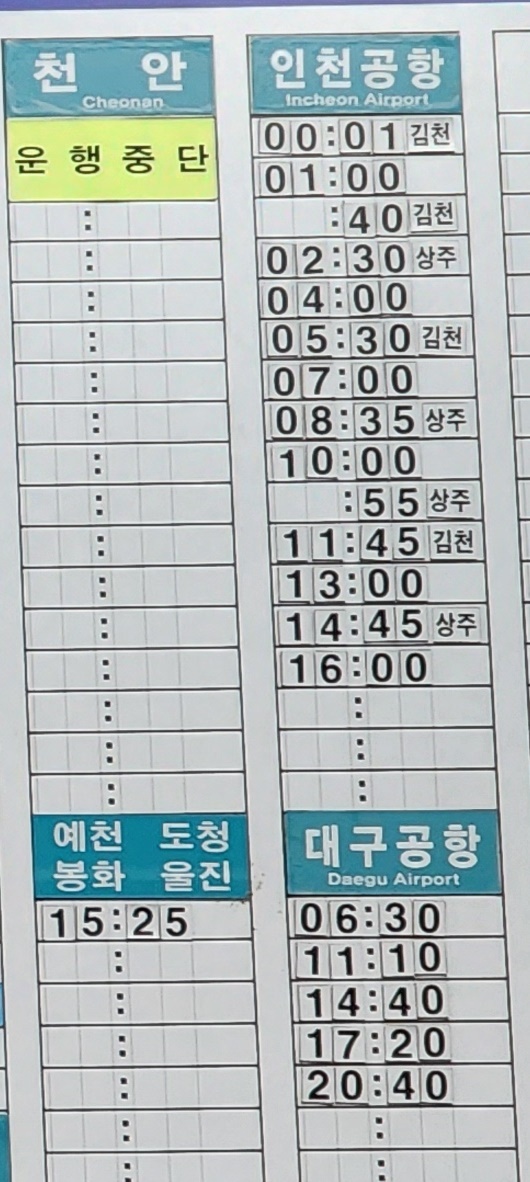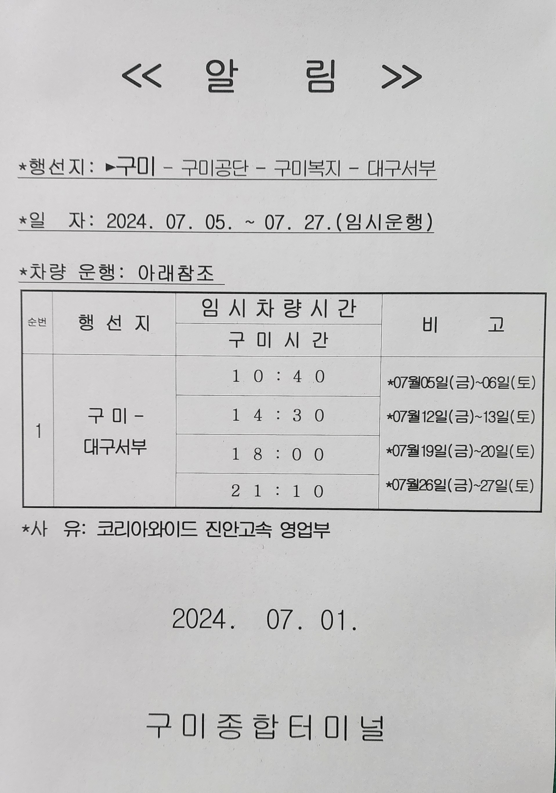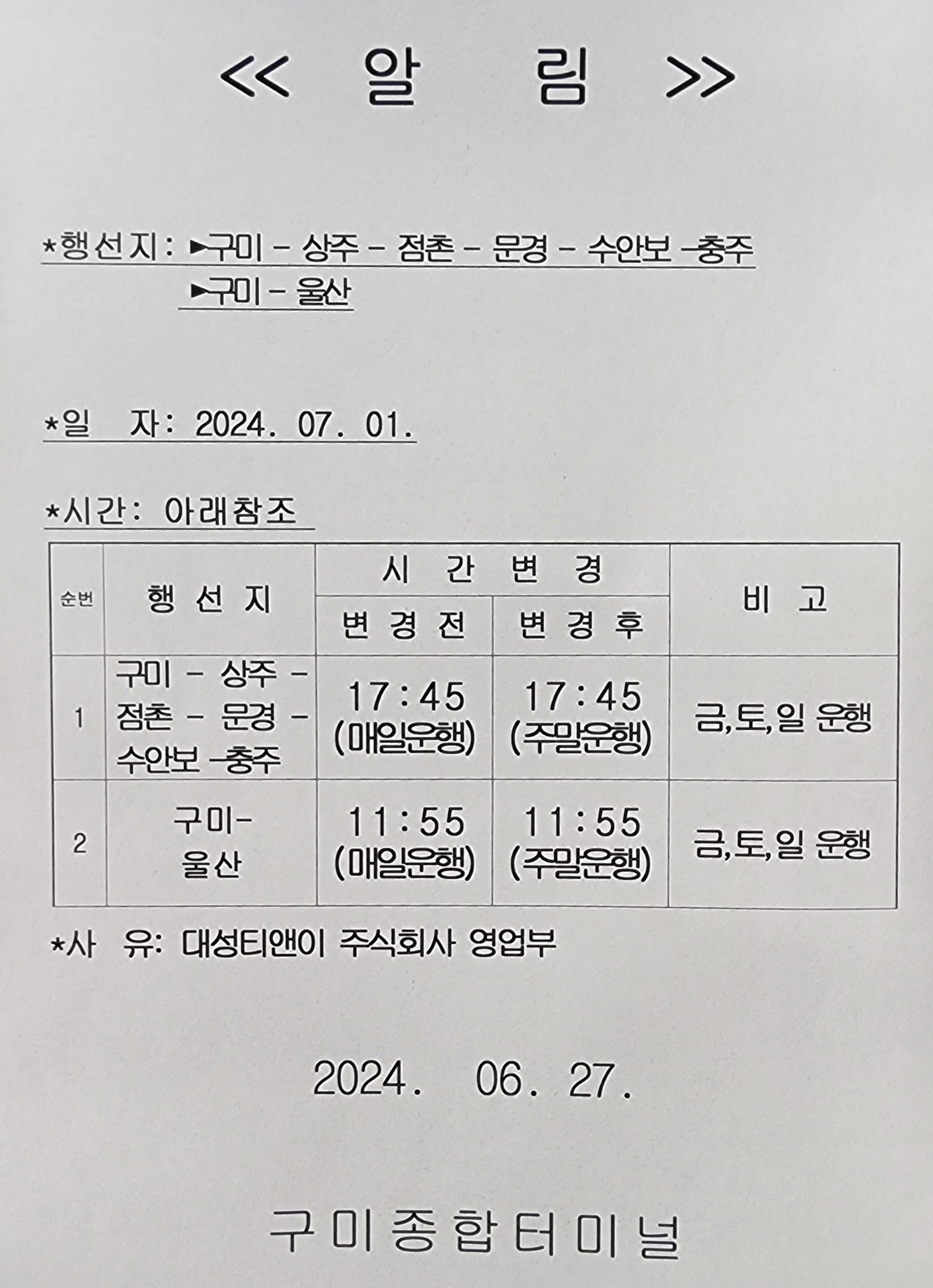 구미 출발 예천, 도청, 봉화, 울진, 인천공항, 대구공항 방면.