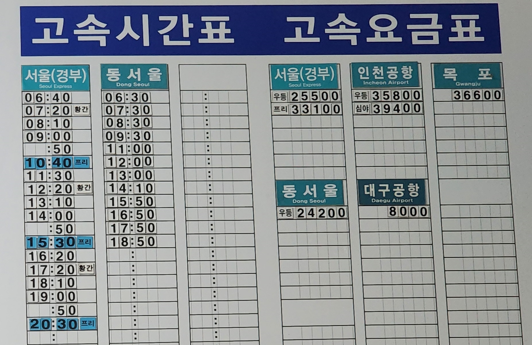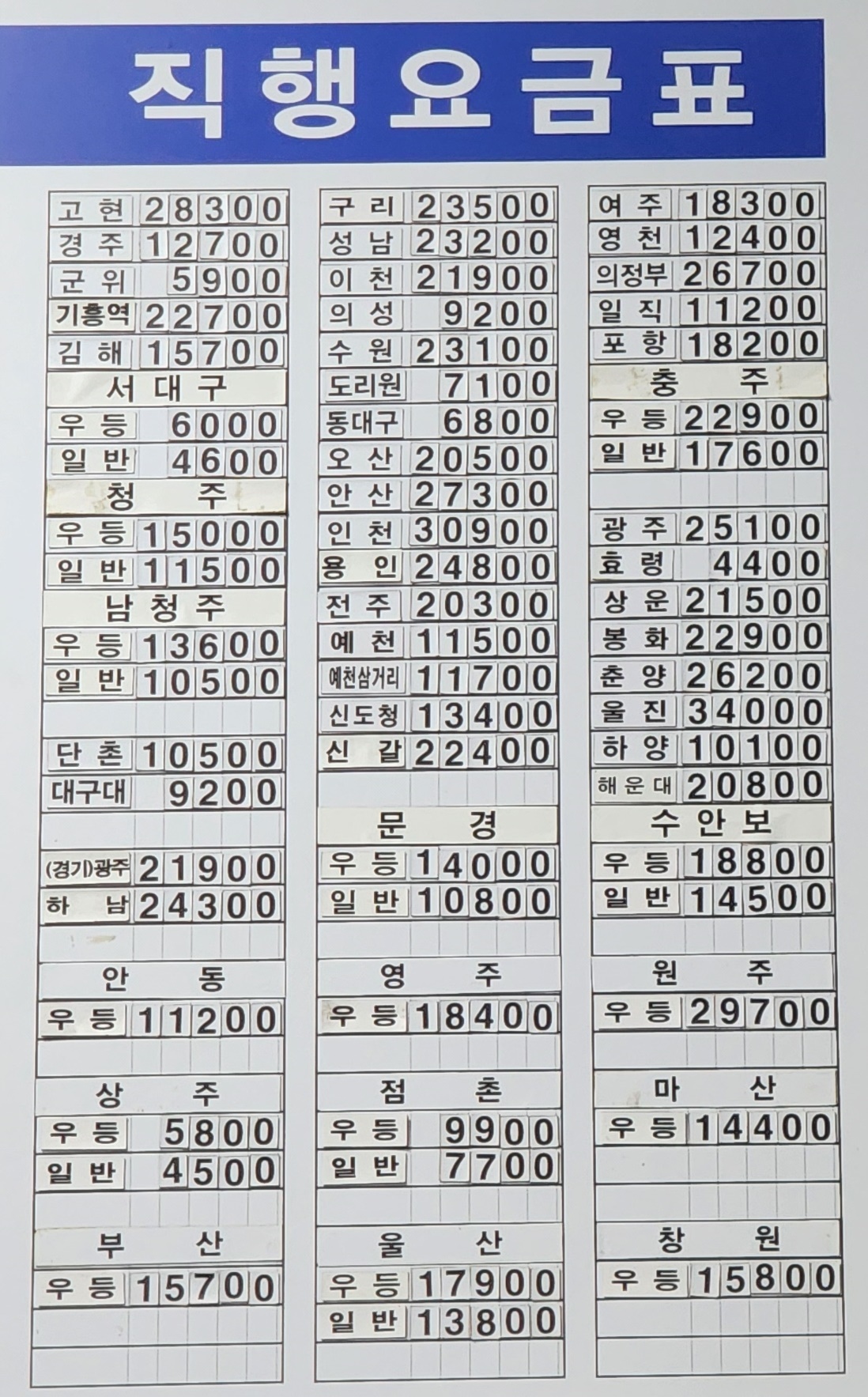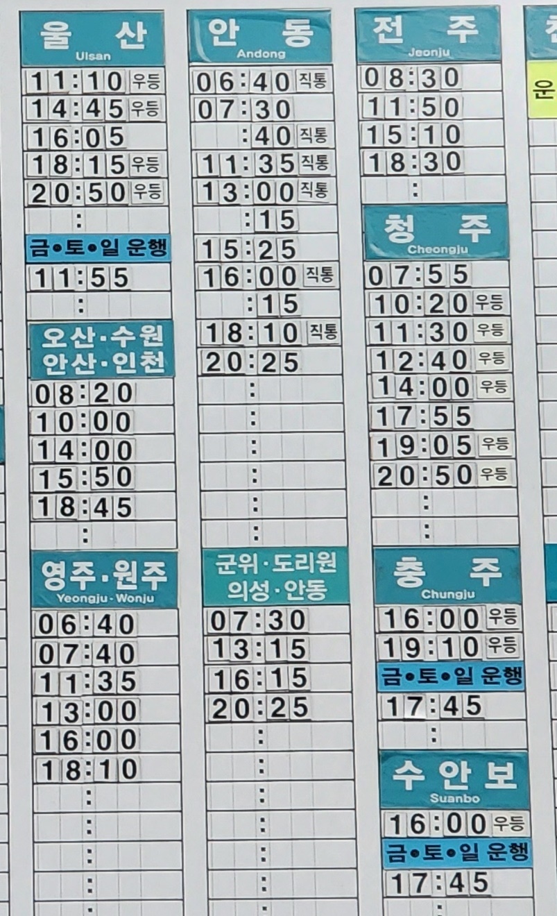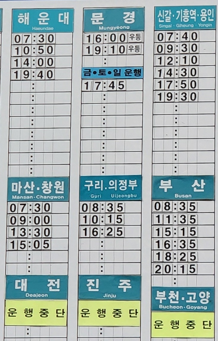 구미 출발 해운대, 마산, 창원, 문경, 구리, 의정부, 신갈, 기흥역, 용인,부산 방면.