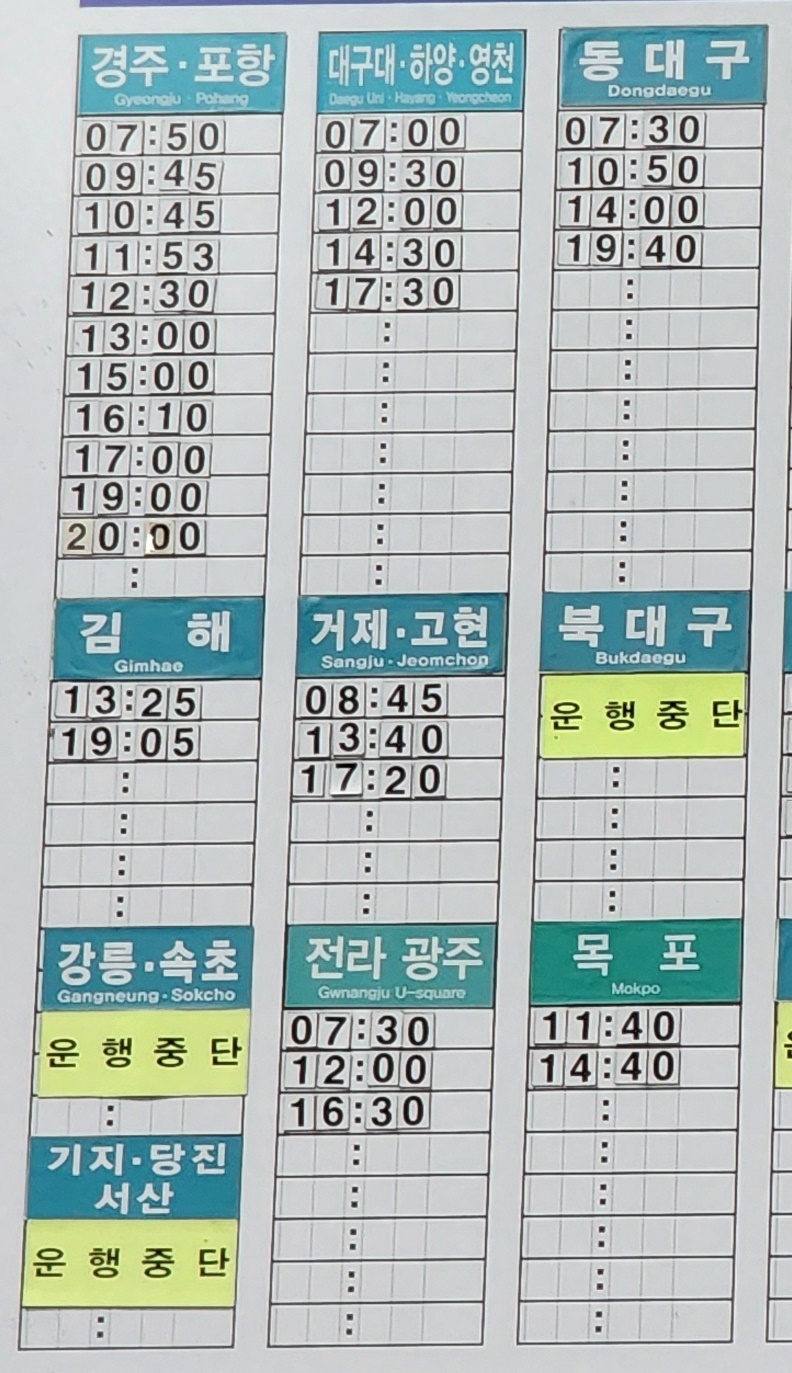 구미 출발 경주, 포항, 김해, 대구대, 하양, 영천, 거제, 고현, 전라광주, 동대구,목포 방면.