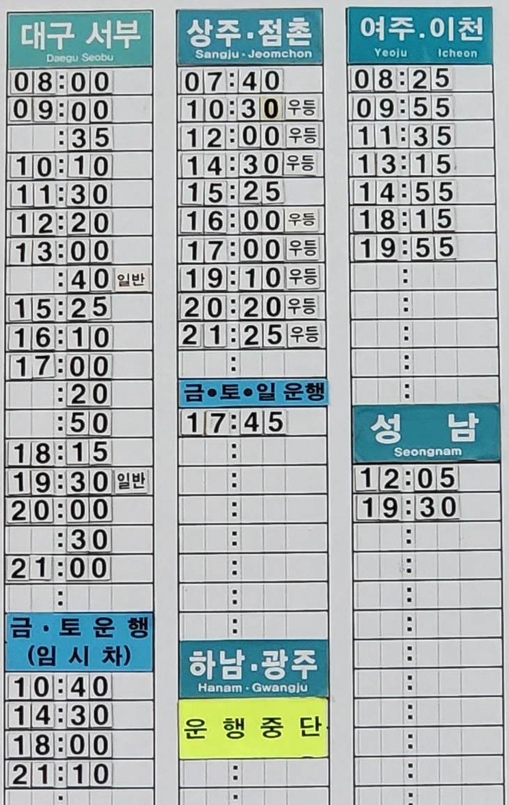 구미 출발 대구 서부, 상주, 점촌, 여주, 이천,성남 방면.