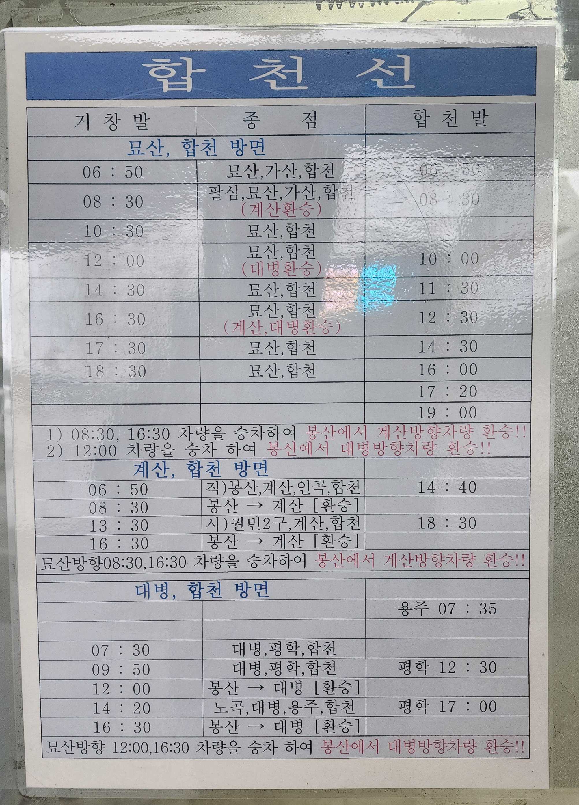 거창 출발 탑선, 온곡, 개흥, 상오정, 수내 방면.
