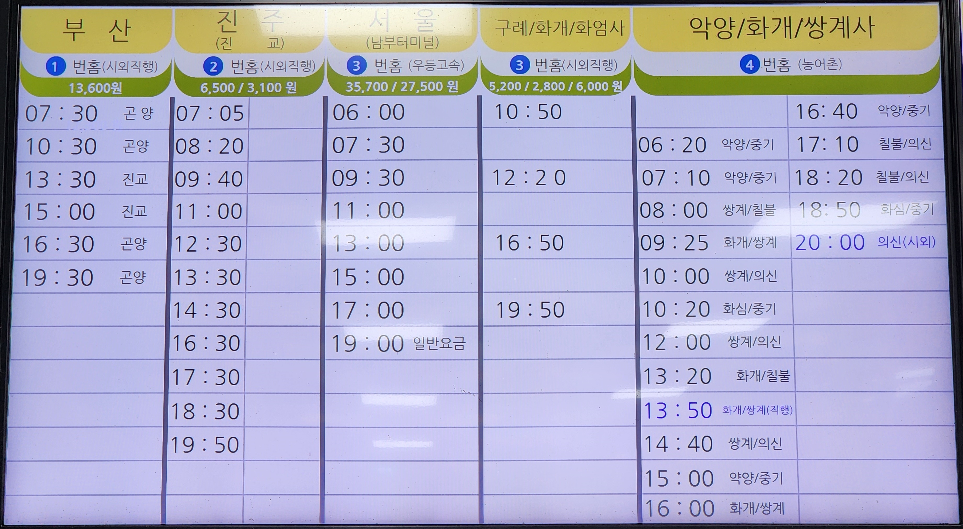 하동시외버스터미널 요금표