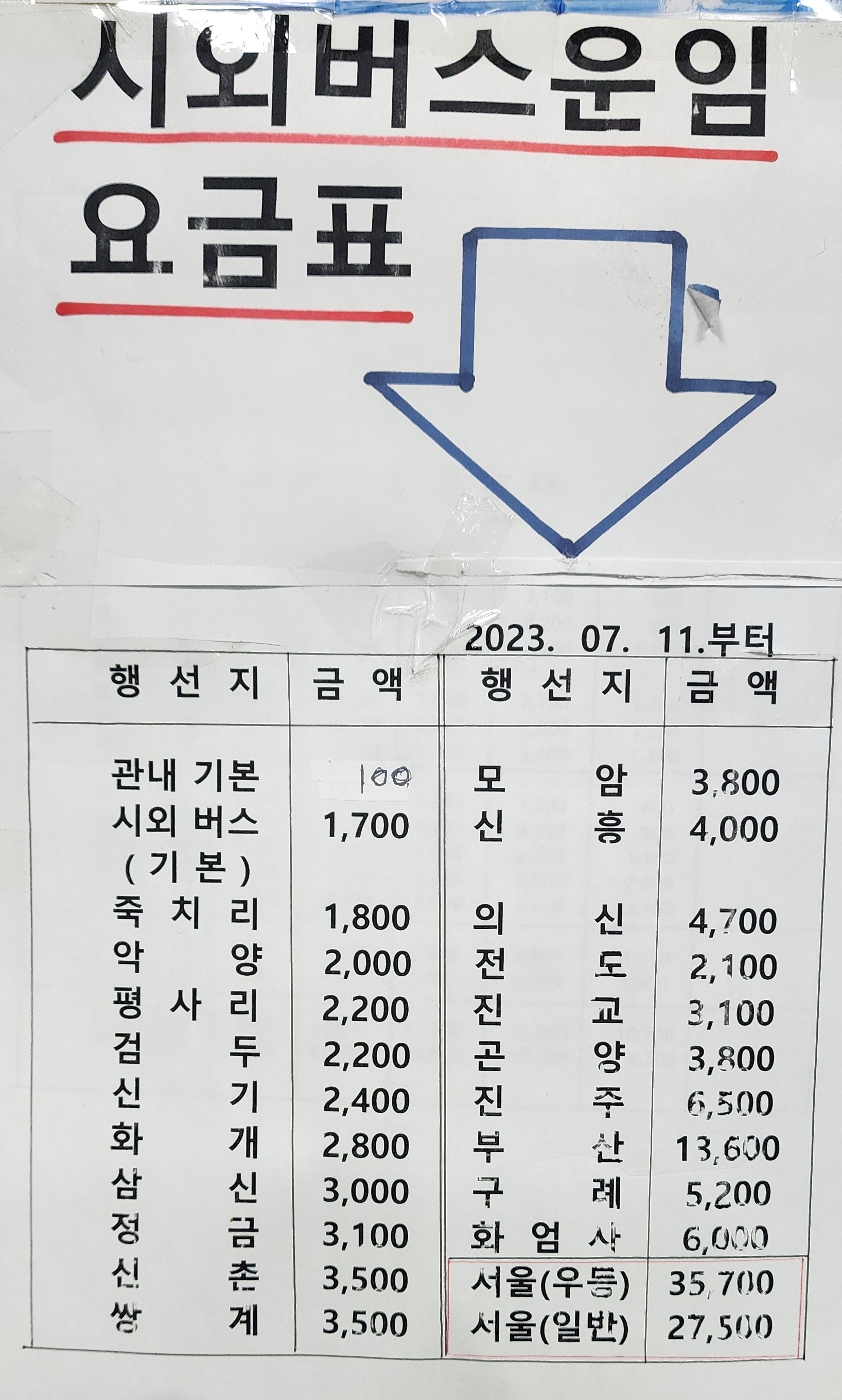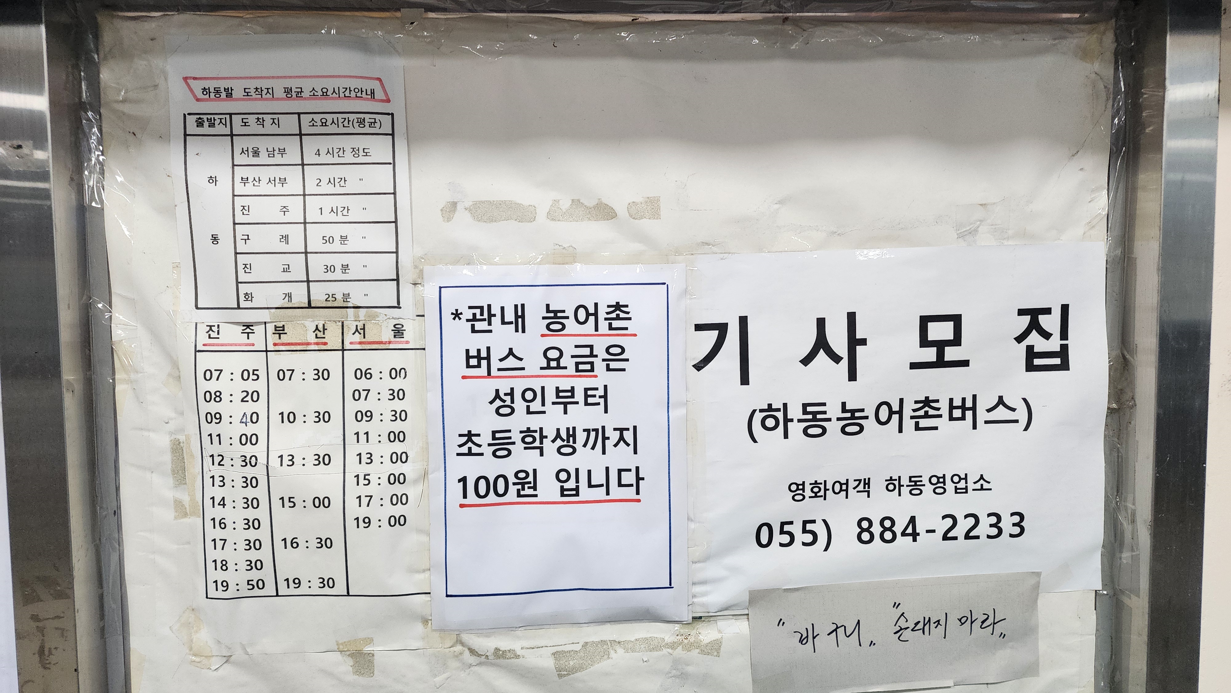 하동시외버스터미널 요금표