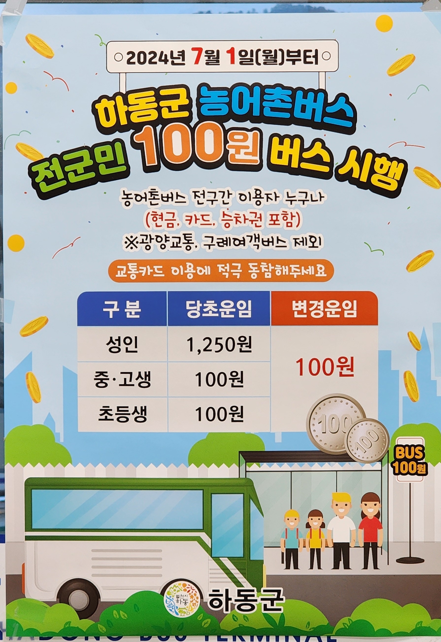 하동 관내 농어촌버스 요금 100원.