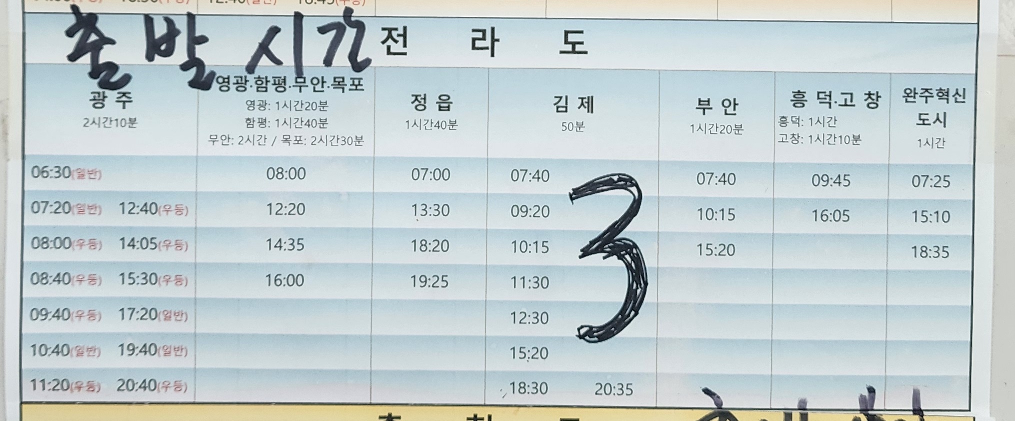 군산 출발 광주, 영광, 함평, 무안, 목포, 정읍, 김제, 부안, 흥억, 고창, 환주혁신도시 방면.