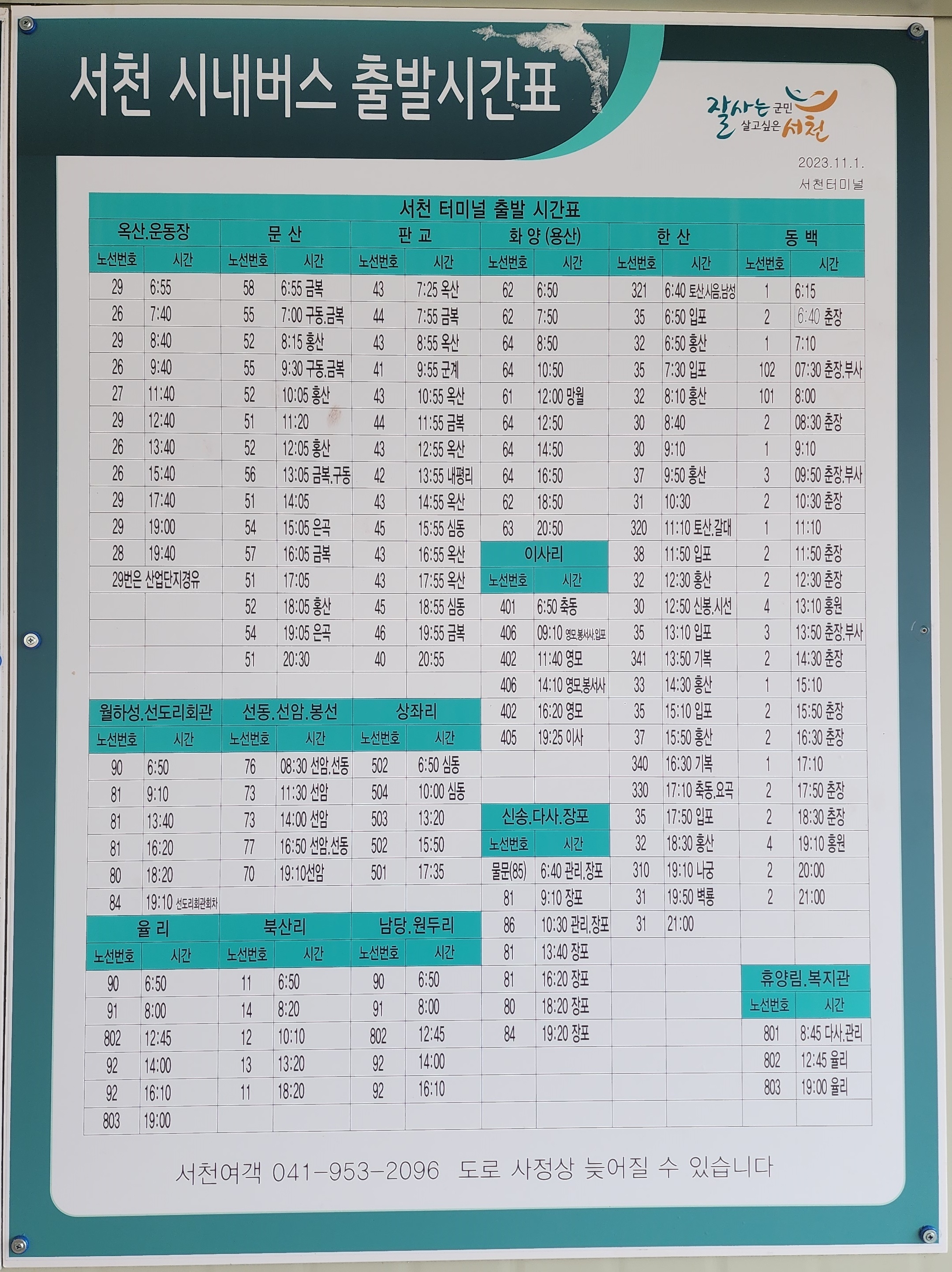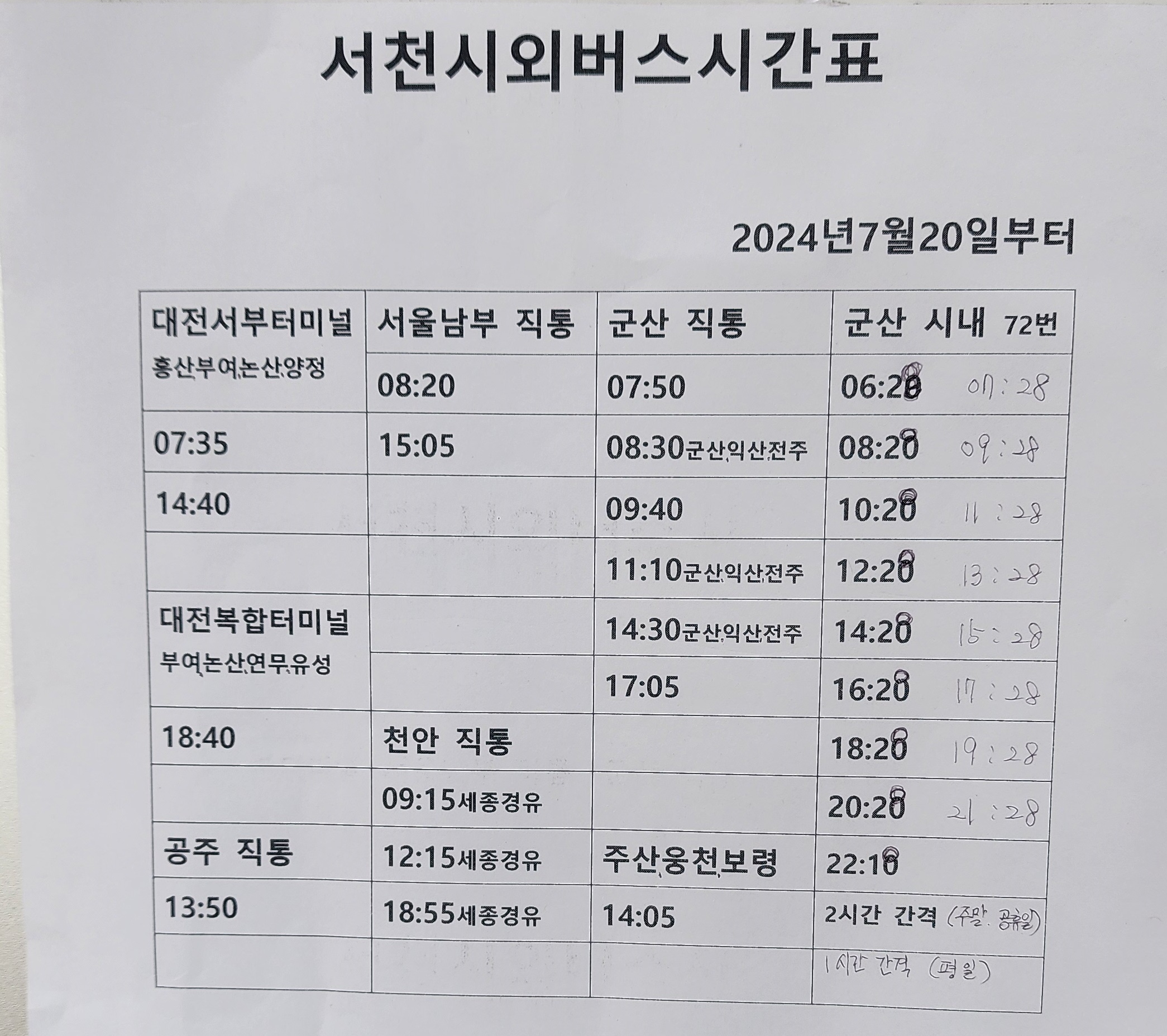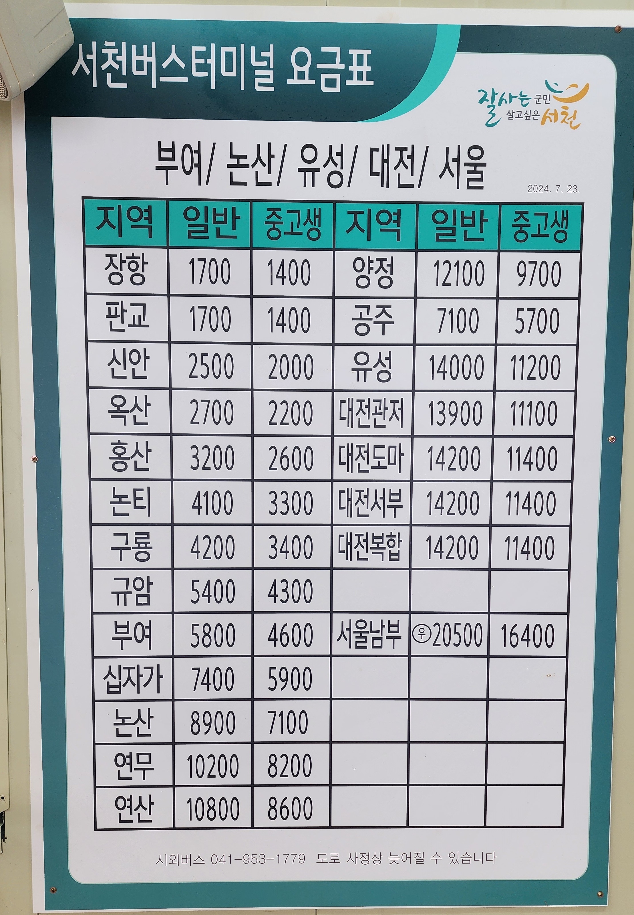 서천시외버스터미널 출발 대전 서부터미널, 흥산, 부여, 논산, 양정, 대전복합터미널 부여,논산, 연무, 유성,