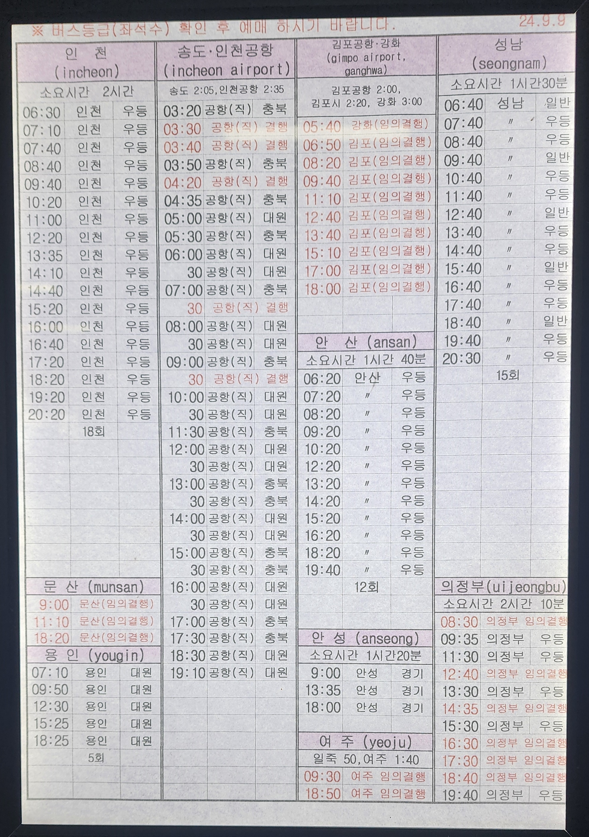 청주 출발 인천, 문산, 용인, 송도, 인천공항, 김포공항, 안산, 안성, 여주, 강화, 성남, 의정부 방면.