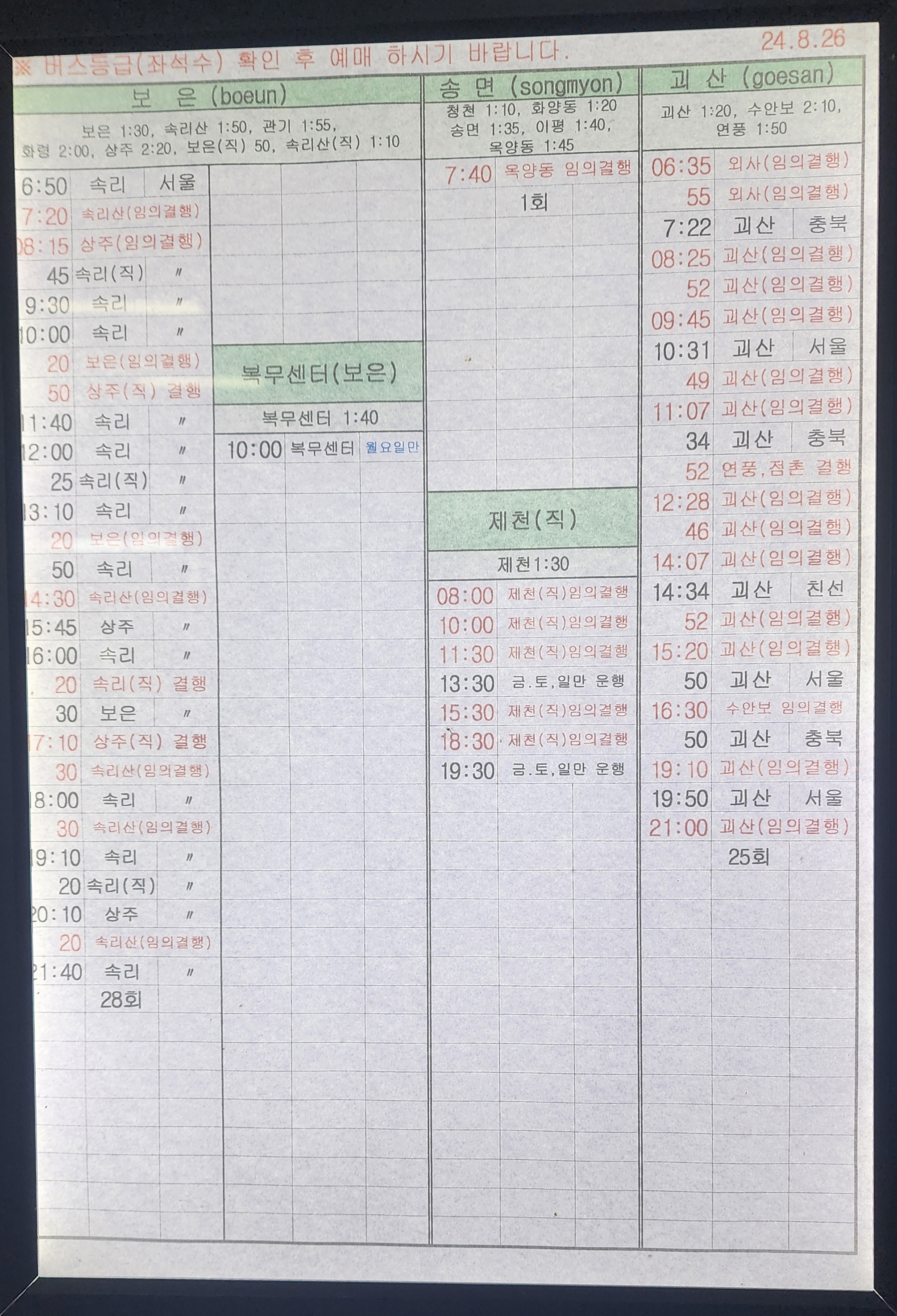 청주 출발 보은, 복무센터 보은, 송면, 제천, 괴산 방면.