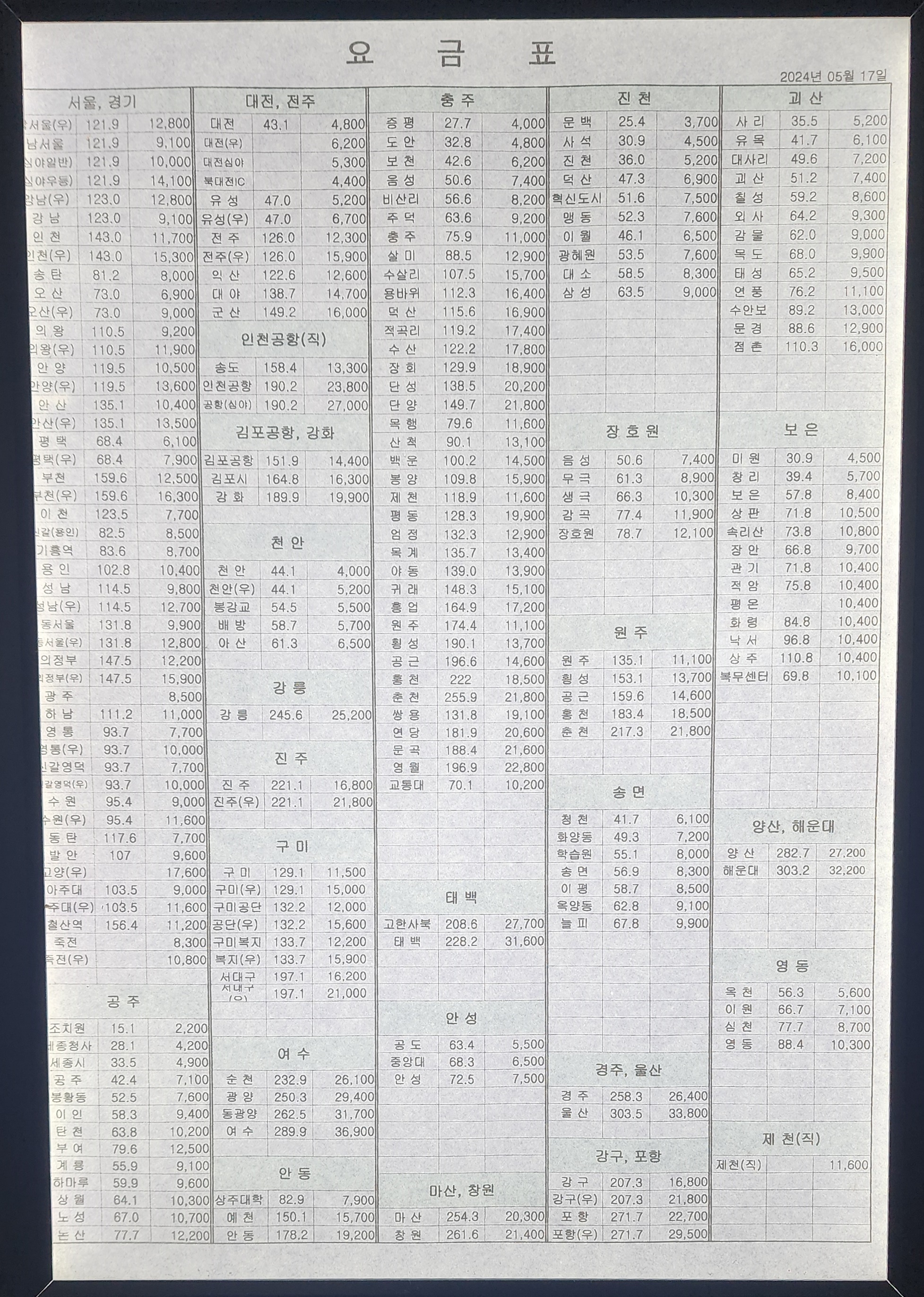 청주 출발 남서울, 강남, 의왕, 안양, 고양 방면.