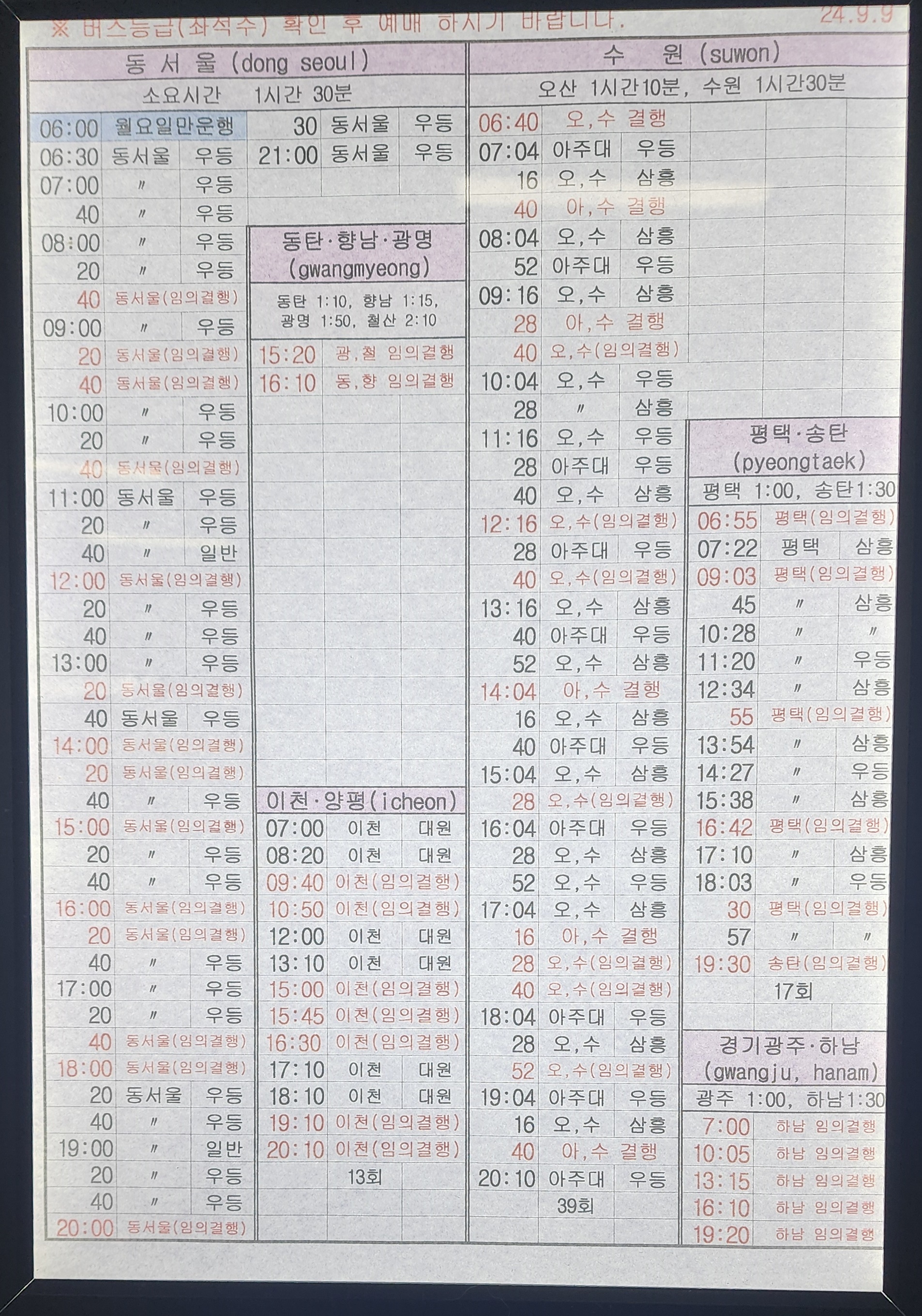 청주 출발 동서울, 동탄, 향남, 광명, 이천, 양평, 수원,평택, 송탄, 경기광주, 하남 방면.